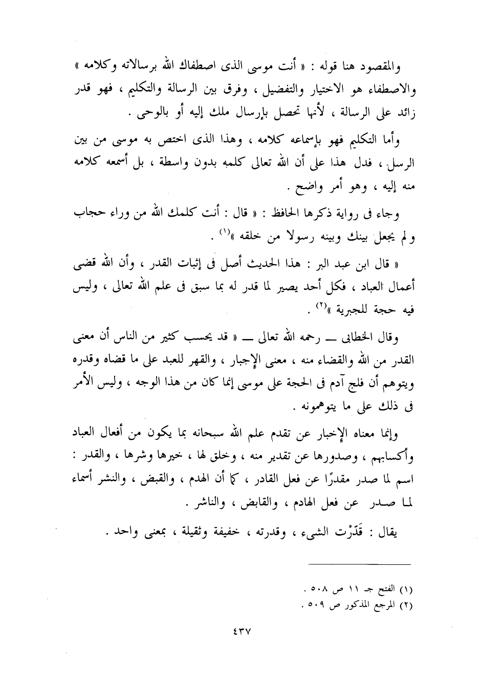 وقال الخطابي – رحمه الله تعالى -: ((قد يحسب كثير من الناس أن معنى القدر من الله والقضاء منه، معنى الإجبار، والقهر للعبد على ما قضاه وقدره، ويتوهم أن فلج آدم في الحجة على موسى إنما كان من هذا الوجه، وليس الأمر في ذلك على ما يتوهمونه.