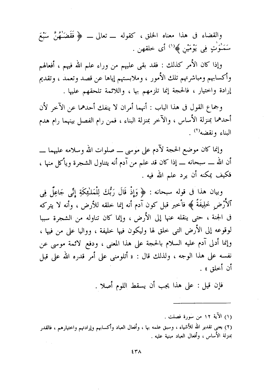 (¬2) يعني: تقدير الله للأشياء، وسبق علمه بها، وأفعال العباد وأكسابهم وإرادتهم واختيارهم، فالقدر بمنزلة الأساس، وأفعال العباد مبنية عليه.