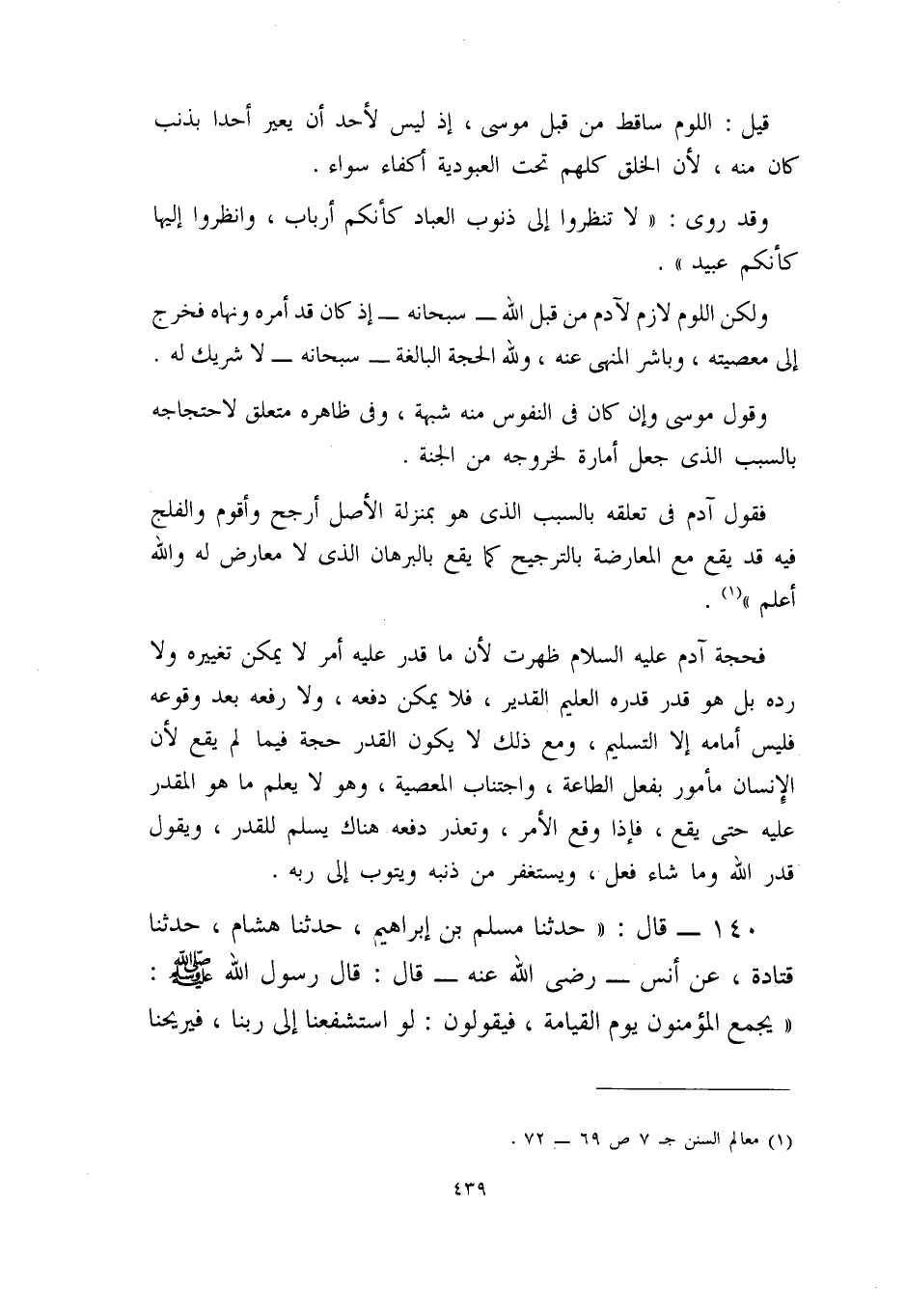 وقول موسى، وإن كان في النفوس منه شبهة، وفي ظاهره متعلق لاحتجاجه بالسبب الذي جعل أمارة لخروجه من الجنة، فقول آدم في تعلقه بالسبب – الذي هو بمنزلة الأصل – أرجح وأقوم، والفلج فيه قد يقع مع المعارضة بالترجيح، كما يقع بالبرهان الذي لا معارض له. والله أعلم)) (¬1) .