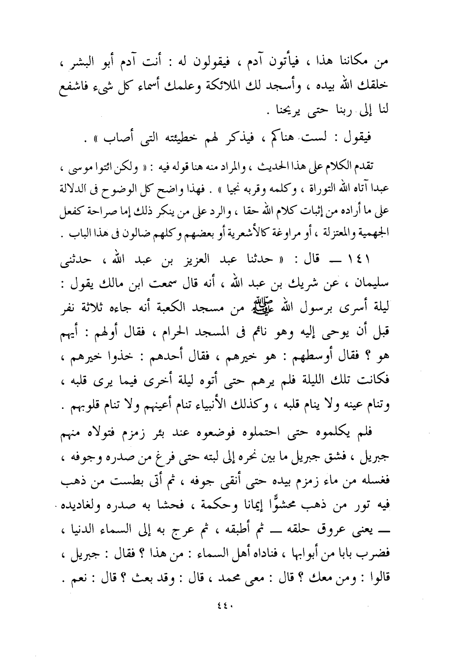 تقدم الكلام على هذا الحديث، والمراد منه هنا قوله فيه: ((ولكن ائتوا موسى، عبداً آتاه الله التوراة، وكلمه وقربه نجياً)) ، فهذا واضح كل الوضوح في الدلالة على ما أراده من إثبات كلام الله حقاً، والرد على من ينكر ذلك، إما صراحة كفعل الجهمية والمعتزلة، أو مراوغة كالأشعرية أو بعضهم، وكلهم ضالون في هذا الباب.