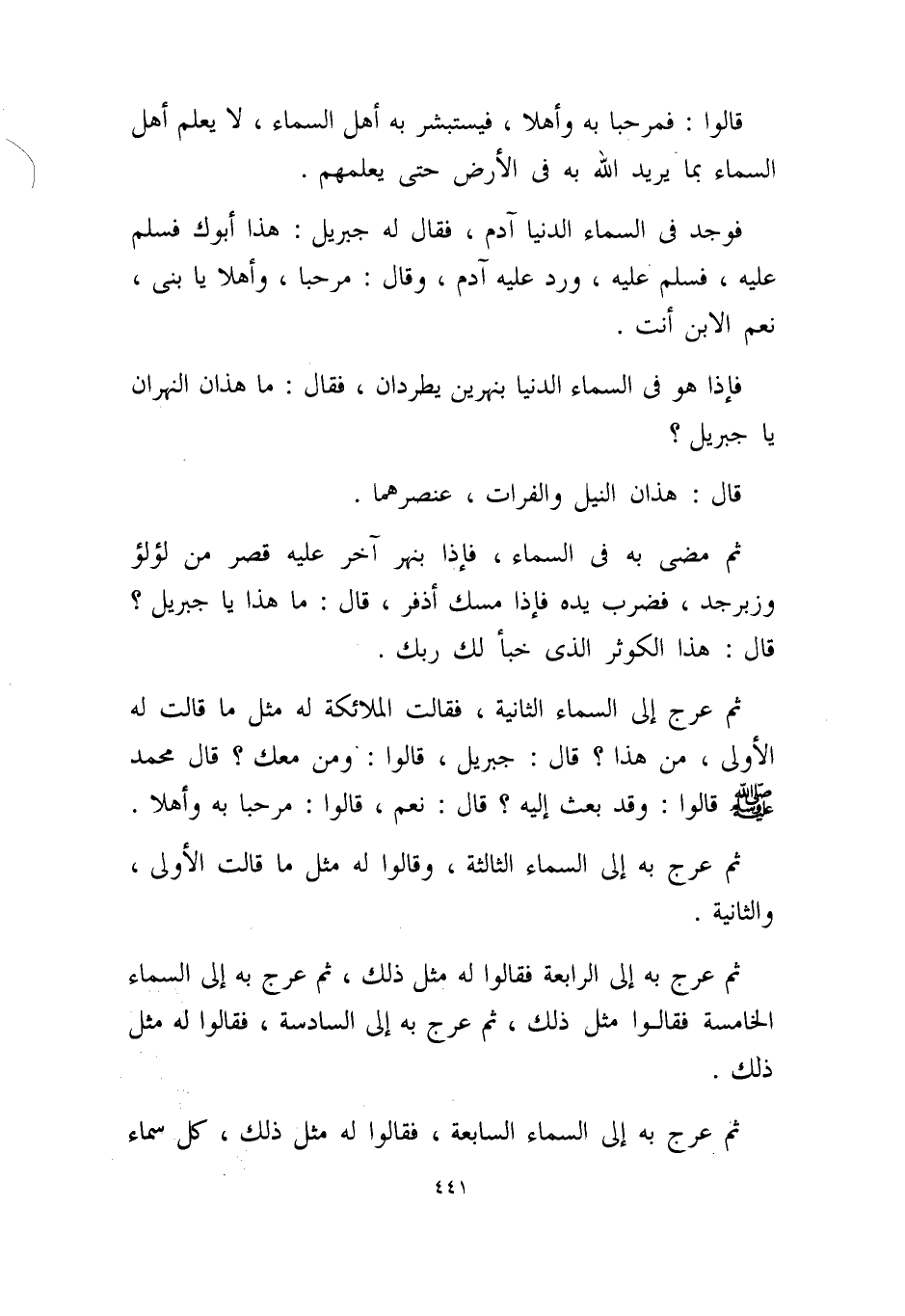 ثم عرج به إلى الرابعة فقالوا له مثل ذلك، ثم عرج به إلى السماء الخامسة فقالوا مثل ذلك، ثم عرج به إلى السادسة، فقالوا له مثل ذلك.