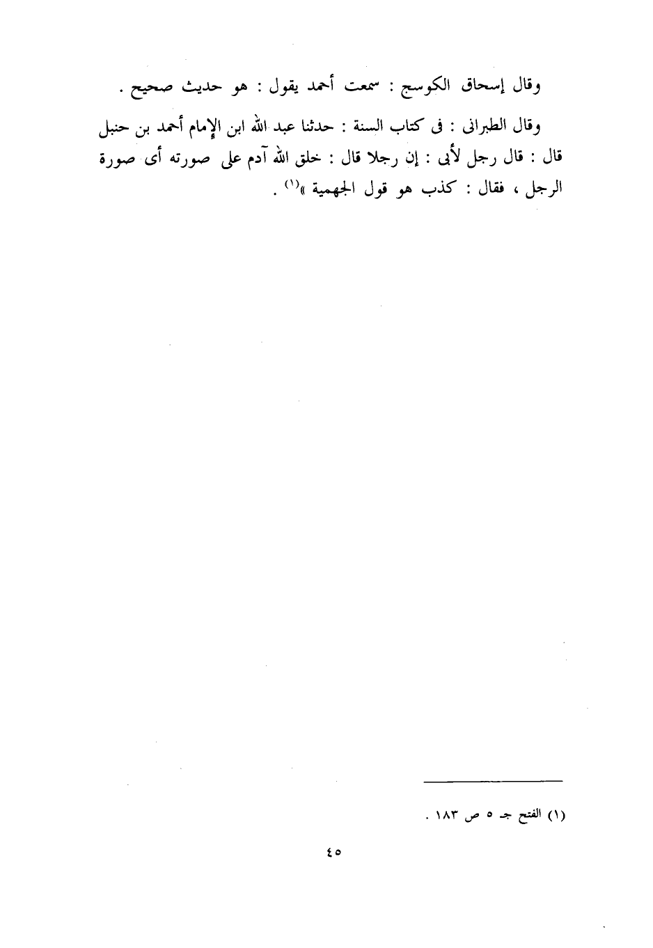 وقال الطبراني: في كتاب السُّنَّة: حدثنا عبد الله ابن الإمام أحمد بن حنبل قال: قال رجل لأبي: إن رجلاً قال: خلق الله آدم على صورته, أي صورة الرجل, فقال: كذب, هو قول الجهمية)) (¬1) .