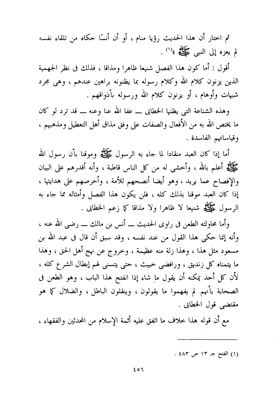 وأما محاولته الطعن في راوي الحديث – أنس بن مالك – رضي الله عنه، وأنه إنما حكى هذا القول من عند نفسه، وقد سبق أن قال في عبد الله بن مسعود مثل هذا، وهذا زلة منه عظيمة، وخروج عن نهج أهل الحق، وهذا ما يتمناه كل زنديق، ورافضي خبيث، حتى يتسنى لهم إبطال الشرع كله؛ لأن كل أحد يمكنه أن يقول ما شاء إذا انفتح هذا الباب، وهو الطعن في الصحابة بأنهم لم يفهموا ما يقولون، وينقلون الباطل والضلال، كما هو مقتضى قول الخطابي.