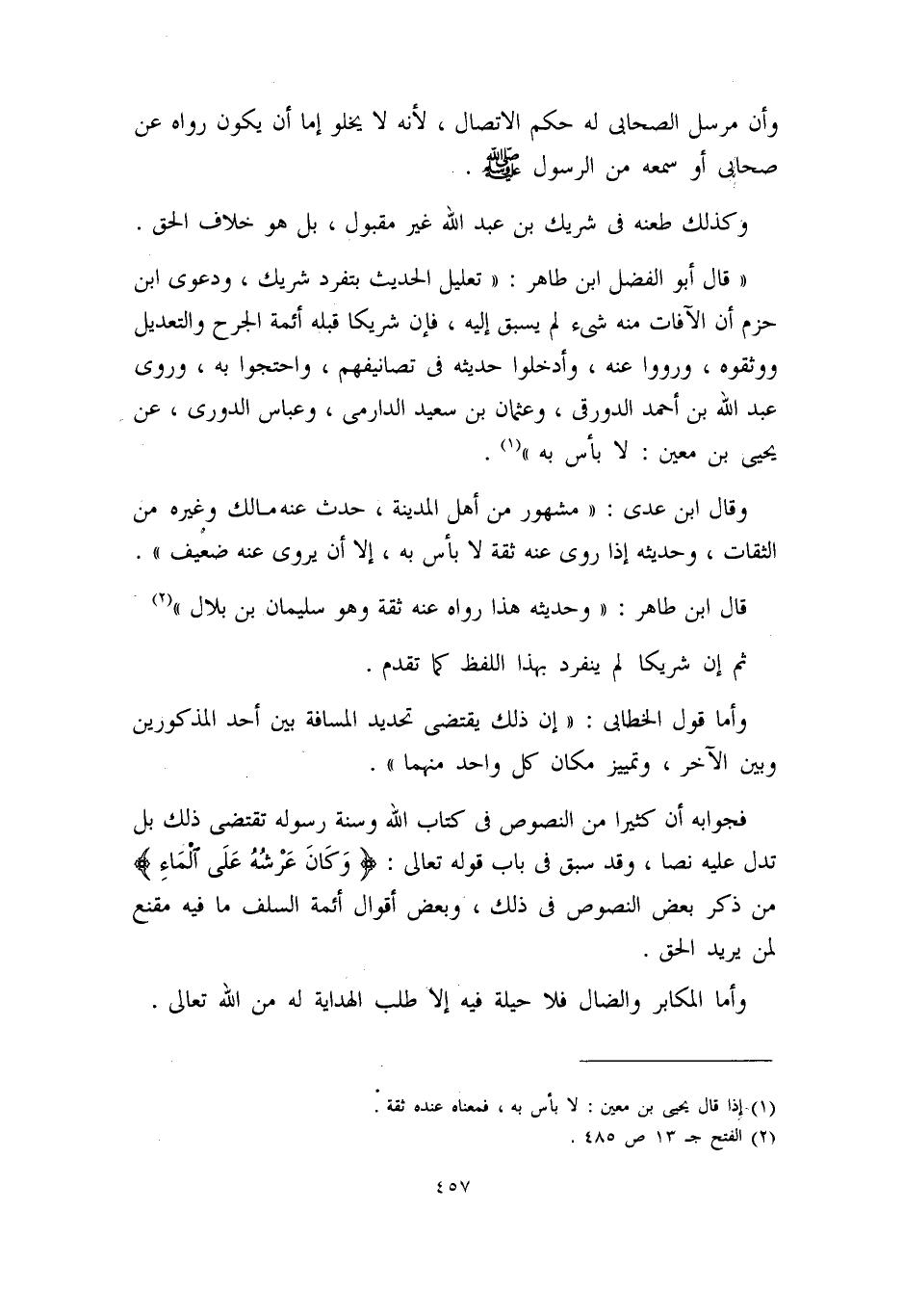 ((قال أبو الفضل ابن طاهر: ((تعليل الحديث بتفرد شريك، ودعوى ابن حزم أن الآفات منه شيء لم يسبق إليه، فإن شريكاً قبله أئمة الجرح والتعديل ووثقوه، ورووا عنه، وأدخلوا حديثه في تصانيفهم، واحتجوا به، وروى عبد الله بن أحمد الدورقي، وعثمان بن سعيد الدارمي، وعباس الدوري، عن يحيى بن معين: لا بأس به)) (¬1) .