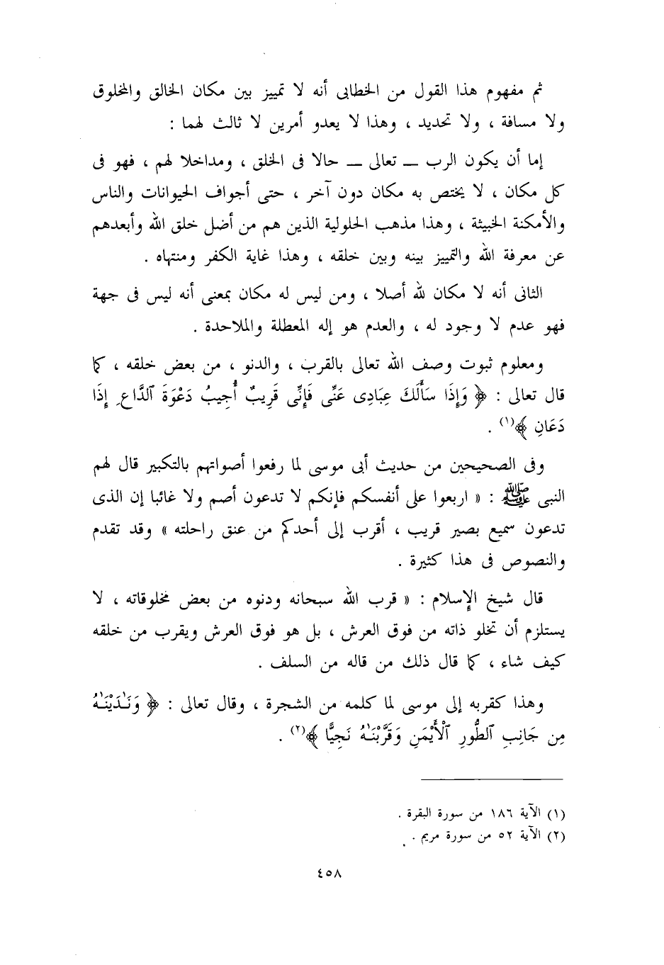 الثاني: أنه لا مكان لله أصلاً، ومن ليس له مكان – بمعنى أنه ليس في جهة – فهو عدم لا وجود له، والعدم هو إله المعطلة والملاحدة.