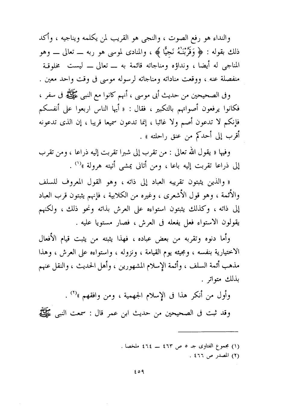 وأما دنوه وتقربه من بعض عباده، فهذا يثبته من يثبت قيام الأفعال الاختيارية بنفسه، ومجيئه يوم القيامة، ونزوله، واستواءه على العرش، وهذا مذهب أئمة السلف، وأئمة الإسلام المشهورين، وأهل الحديث، والنقل عنهم بذلك متواتر.