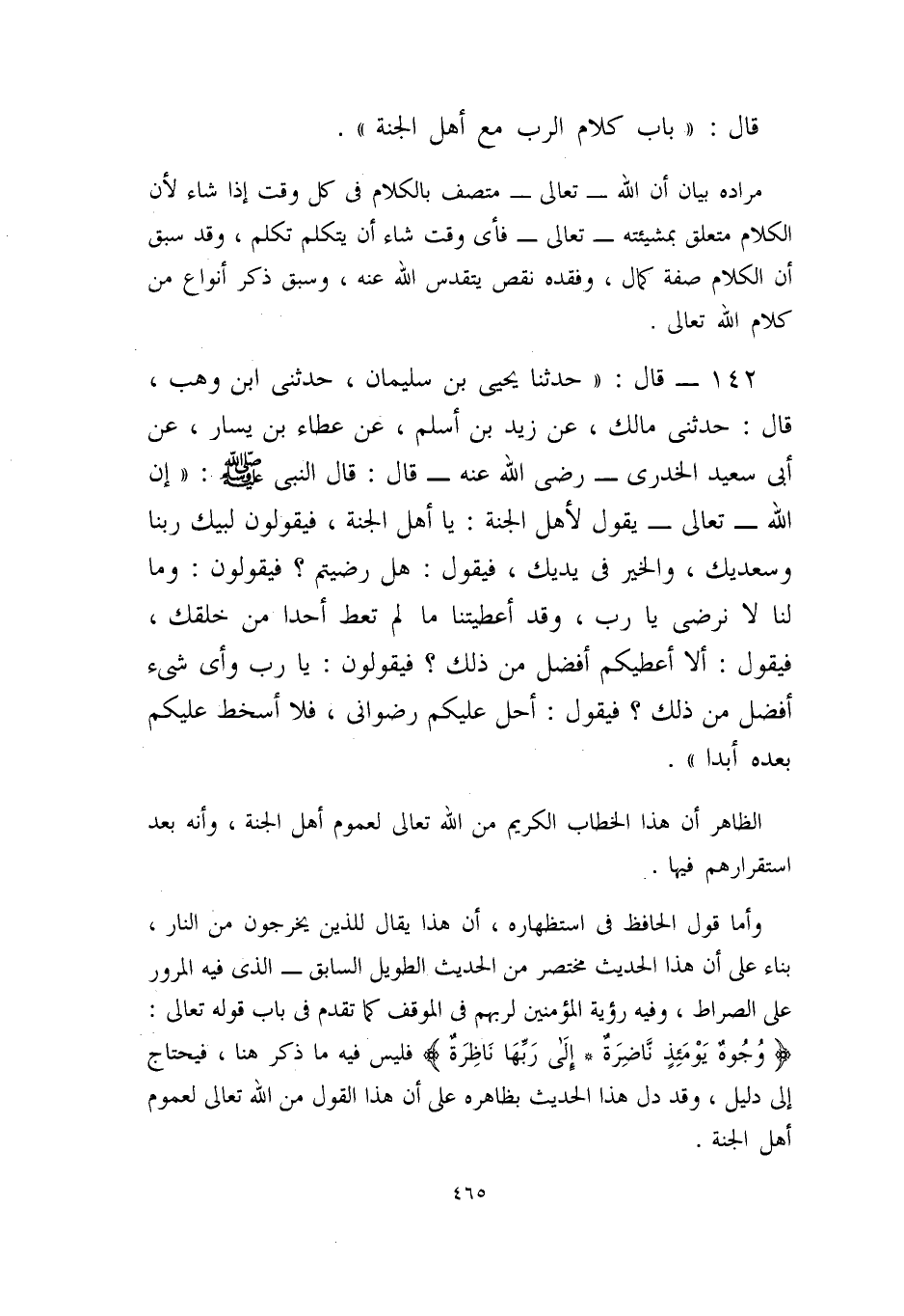 وأما قول الحافظ في استظهاره، أن هذا يقال للذين يخرجون من النار، بناء على أن هذا الحديث مختصر من الحديث الطويل السابق، الذي فيه المرور على الصراط، وفيه رؤية المؤمنين لربهم في الموقف، كما تقدم في باب قوله تعالى: {وُجُوهٌ يَوْمَئِذٍ نَّاضِرَةٌ {22} إِلَى رَبِّهَا نَاظِرَةٌ} ، فليس فيه ما ذكر هنا، فيحتاج إلى دليل، وقد دل هذا الحديث بظاهره على أن هذا القول من الله - تعالى - لعموم أهل الجنة.