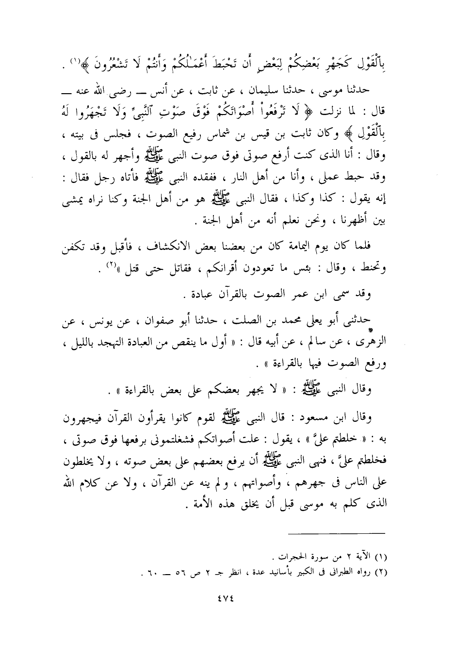وقال ابن مسعود: قال النبي - صلى الله عليه وسلم - لقوم كانوا يقرؤون القرآن فيجهرون به: ((خلطتم عليَّ)) ، يقول: علت أصواتكم فشغلتموني برفعها فوق صوتي، فخلطتم عليَّ، فنهى النبي - صلى الله عليه وسلم - أن يرفع بعضهم على بعض صوته، ولا يخلطون على الناس في جهرهم، وأصواتهم، ولم ينه عن القرآن، ولا عن كلام الله الذي كلم به موسى قبل أن يخلق هذه الأمة.