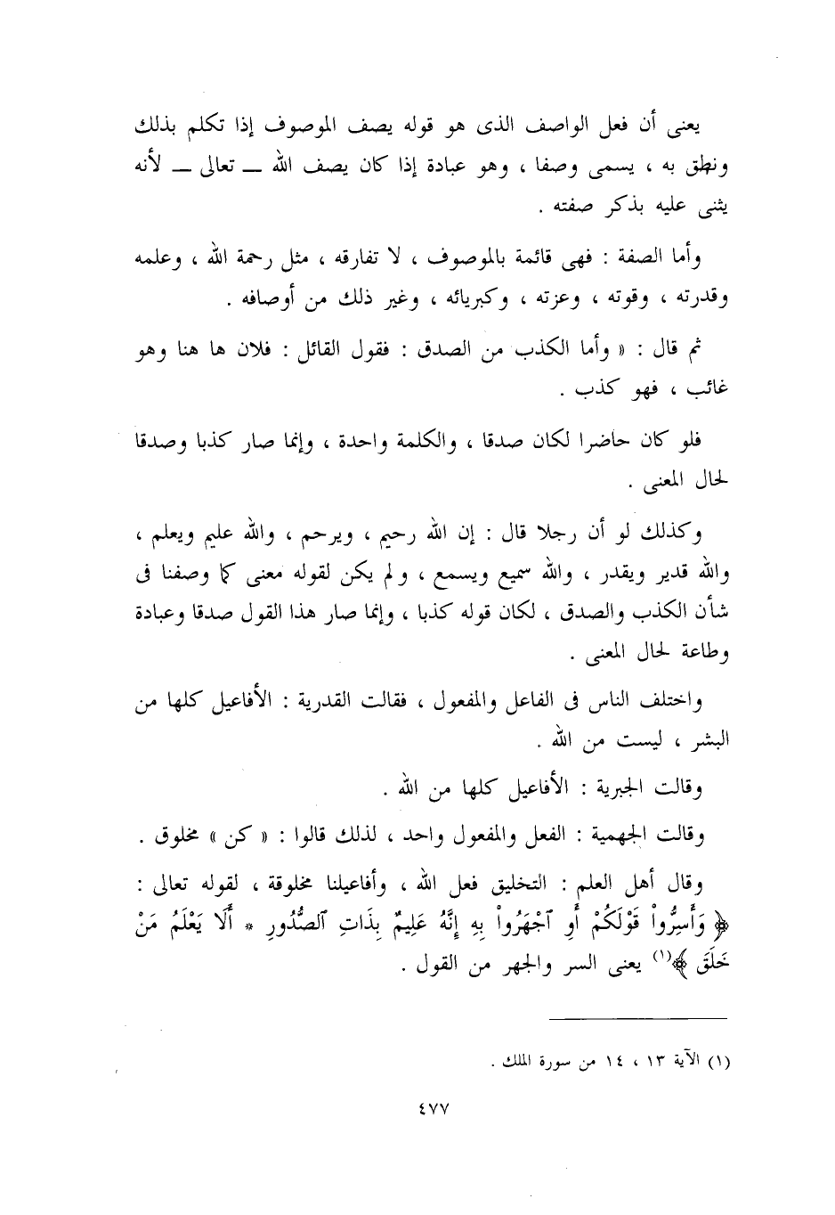 وقال أهل العلم: التخليق فعل الله، وأفاعيلنا مخلوقة؛ لقوله تعالى: {وَأَسِرُّوا قَوْلَكُمْ أَوِ اجْهَرُوا بِهِ إِنَّهُ عَلِيمٌ بِذَاتِ الصُّدُورِ} (¬1) . يعني: السر والجهر من القول.