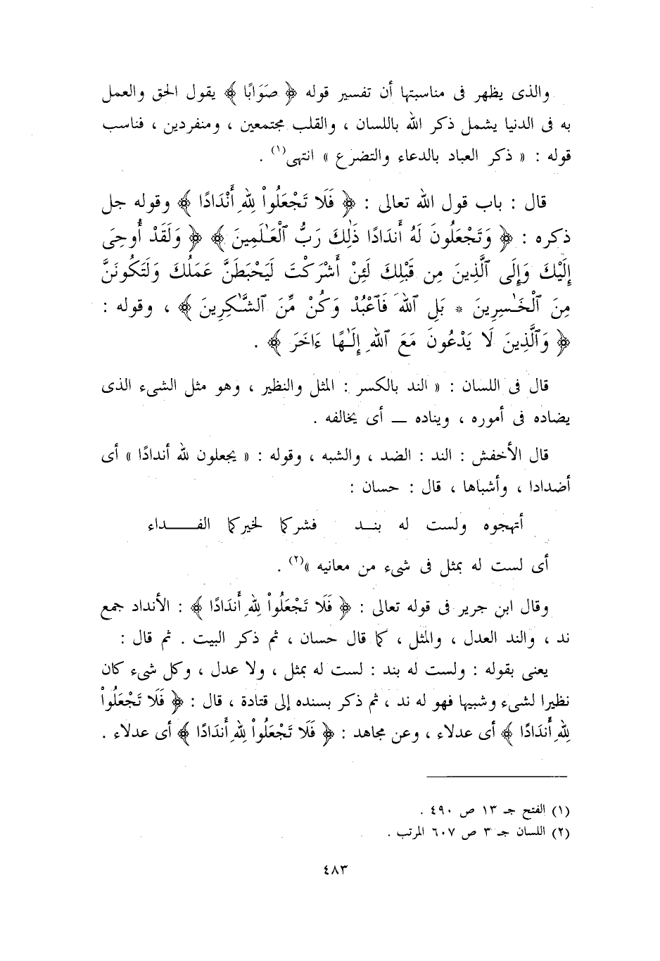 قال: باب قول الله تعالى: {فَلاَ تَجْعَلُواْ لِلّهِ أَندَاداً وَأَنتُمْ تَعْلَمُونَ} وقوله جل ذكره: {وَتَجْعَلُونَ لَهُ أَندَادًا ذَلِكَ رَبُّ الْعَالَمِين} ، {وَلَقَدْ أُوحِيَ إِلَيْكَ وَإِلَى الَّذِينَ مِنْ قَبْلِكَ لَئِنْ أَشْرَكْتَ لَيَحْبَطَنَّ عَمَلُكَ وَلَتَكُونَنَّ مِنَ الْخَاسِرِينَ {65} بَلِ اللَّهَ فَاعْبُدْ وَكُن مِّنْ الشَّاكِرِين} وقوله: {وَالَّذِينَ لا يَدْعُونَ مَعَ اللَّهِ إِلَهًا آخَرَ} .