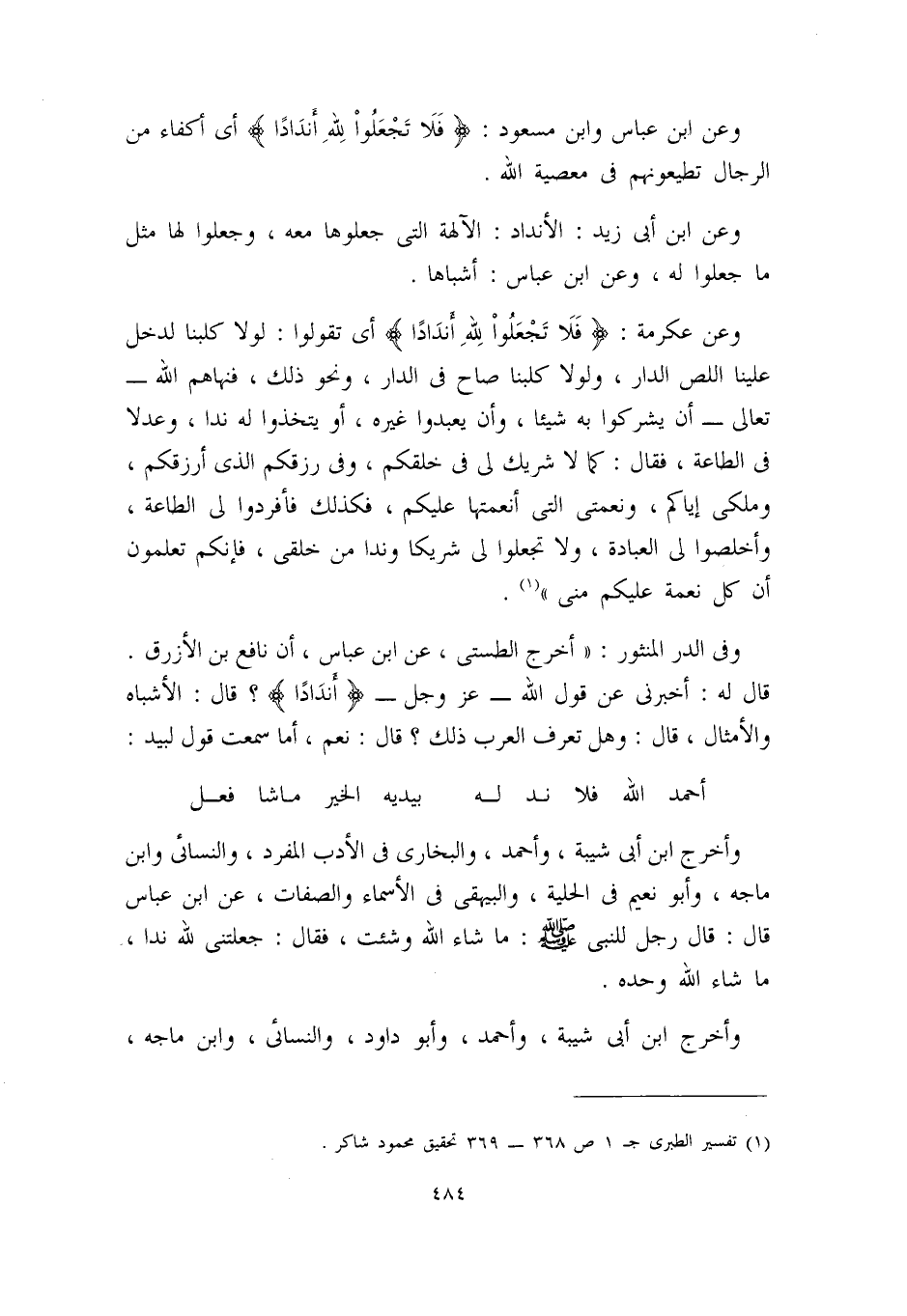 وفي ((الدر المنثور)) : ((أخرج الطستي، عن ابن عباس، أن نافع بن الأزرق قال له: أخبرني عن قول الله - عز وجل - {أَندَاداًً} ؟ قال: الأشباه والأمثال، قال: وهل تعرف العرب ذلك؟ قال: نعم، أما سمعت قول لبيد: