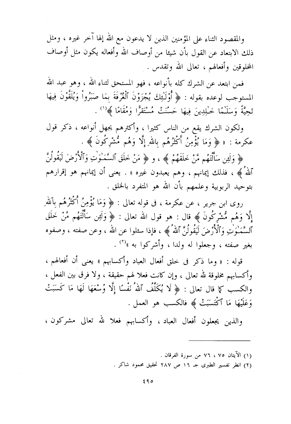 روى ابن جرير، عن عكرمة، في قوله تعالى: {وَمَا يُؤْمِنُ أَكْثَرُهُمْ بِاللهِ إِلاَّ وَهُم مُّشْرِكُونَ} قال: هو قول الله – تعالى - {وَلَئِن سَأَلْتَهُم مَّنْ خَلَقَ السَّمَاوَاتِ وَالأَرْضَ لَيَقُولُنَّ اللَّهُ} ، فإذا سئلوا عن الله، وعن صفته، وصفوه بغير صفته، وجعلوا له ولداً، وأشركوا به)) (¬2) .