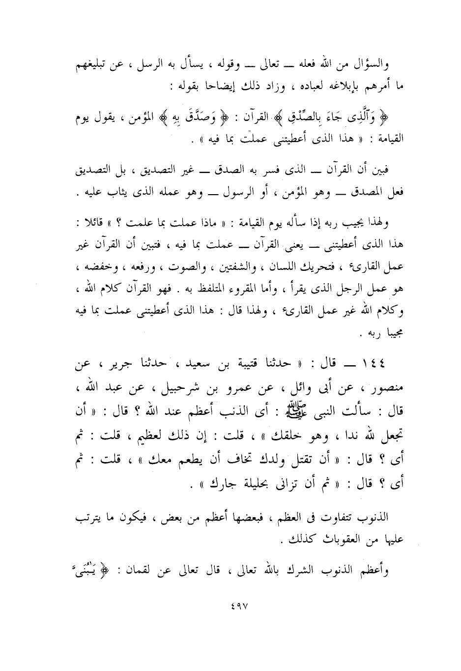 146 – قال: ((حدثنا قتيبة بن سعيد، حدثنا جرير، عن منصور، عن أبي وائل، عن عمرو بن شرحبيل، عن عبد الله، قال: سألت النبي – صلى الله عليه وسلم – أي الذنب أعظم عند الله؟ قال: ((أن تجعل لله نداً، وهو خلقك)) ، قلت: إن ذلك لعظيم، قلت: ثم أي؟ قال: ((أن تقتل ولدك تخاف أن يطعم معك)) ، قلت: ثم أي؟ قال: ((ثم أن تزاني بحليلة جارك)) .