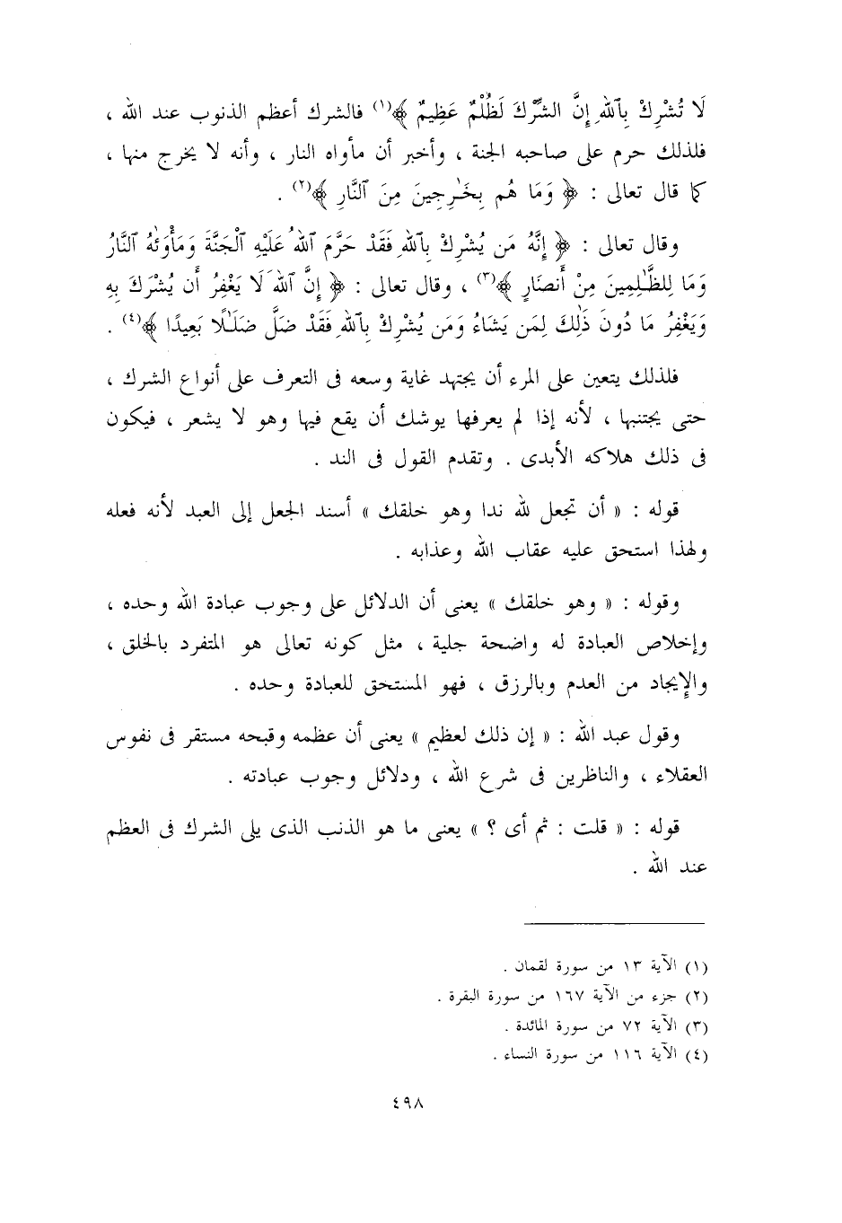 لا تُشْرِكْ بِاللَّهِ إِنَّ الشِّرْكَ لَظُلْمٌ عَظِيمٌ} (¬1) ، فالشرك أعظم الذنوب عند الله، فلذلك حرم على صاحبه الجنة، وأخبر أن مأواه النار، وأنه لا يخرج منها كما قال تعالى: {وَمَا هُم بِخَارِجِينَ مِنَ النَّارِ} (¬2) .