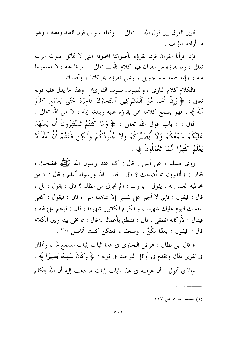 فالكلام كلام الباري، والصوت صوت القارئ. وهذا ما يدل عليه قوله تعالى: {وَإِن أحَدٌ مِنَ المُشرِكينَ استَجَارَكَ فَأَجِرهُ حَتَّىَ يَسمَعَ كَلاَمَ اللهِ} فهو يسمع كلامه ممن يقرؤه عليه يبلغه إياه، لا من الله - تعالى -.