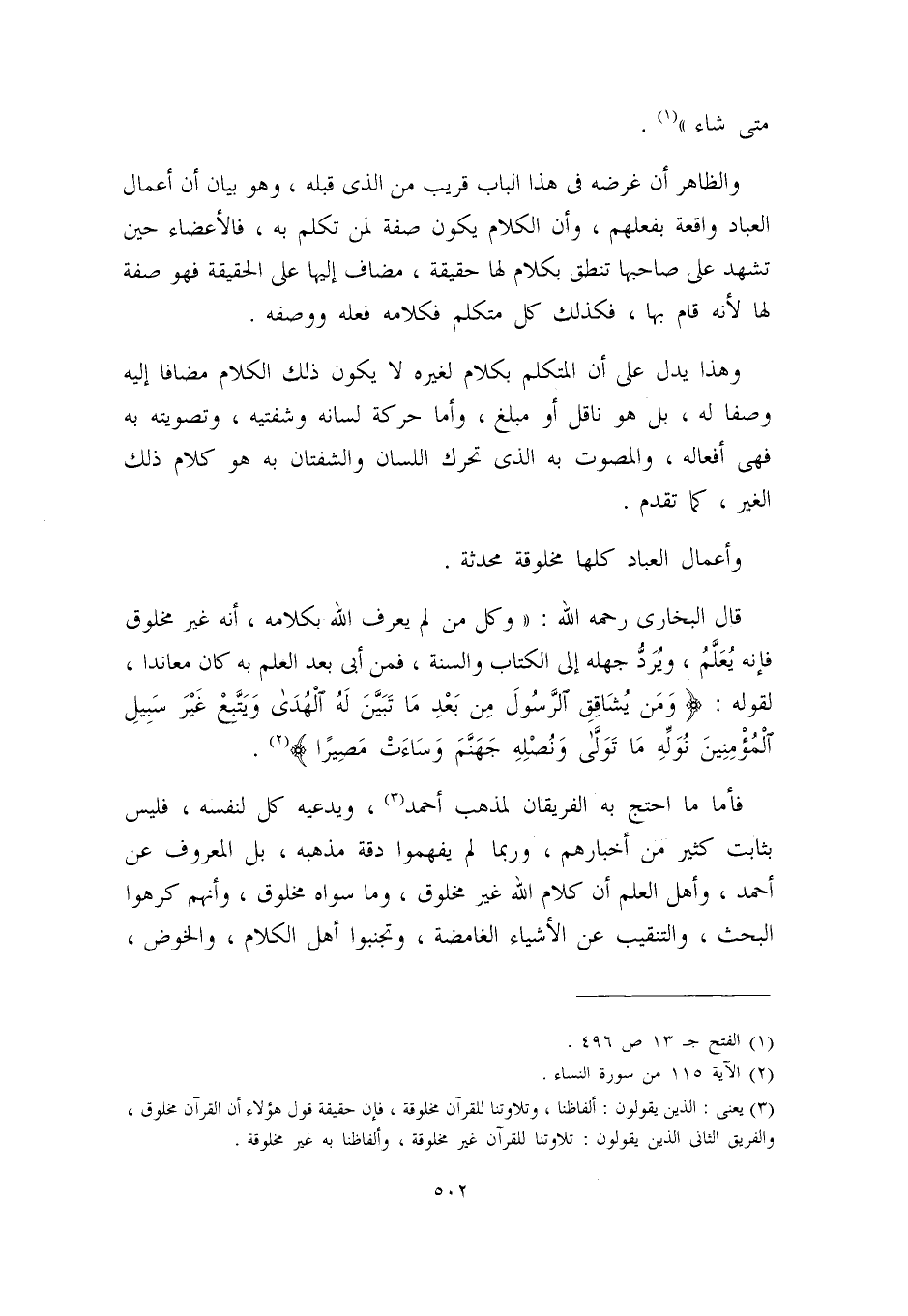 قال البخاري – رحمه الله -: ((وكل من لم يعرف الله بكلامه، أنه غير مخلوق، فإنه يعلم، ويرد جهله إلى الكتاب والسنة، فمن أبى بعد العلم به كان معانداً؛ لقوله: {وَمَن يُشَاقِقِ الرَّسُولَ مِن بَعْدِ مَا تَبَيَّنَ لَهُ الْهُدَى وَيَتَّبِعْ غَيْرَ سَبِيلِ الْمُؤْمِنِينَ نُوَلِّهِ مَا تَوَلَّى وَنُصْلِهِ جَهَنَّمَ وَسَاءتْ مَصِيرًا} (¬2) .