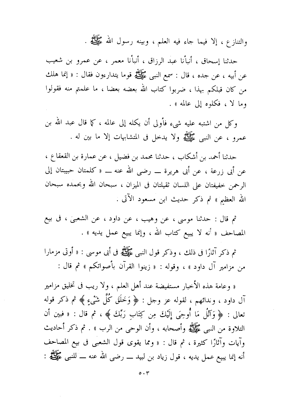 حدثنا إسحاق، أنبأنا عبد الرزاق، أنبأنا معمر، عن عمرو بن شعيب، عن أبيه، عن جده، قال: سمع النبي – صلى الله عليه وسلم – قوماً يتدارءون فقال: ((إنما هلك من كان قبلكم بهذا، ضربوا كتاب الله بعضه بعضاً، ما علمتم منه فقولوا، وما لا فكلوه إلى عالمه)) .