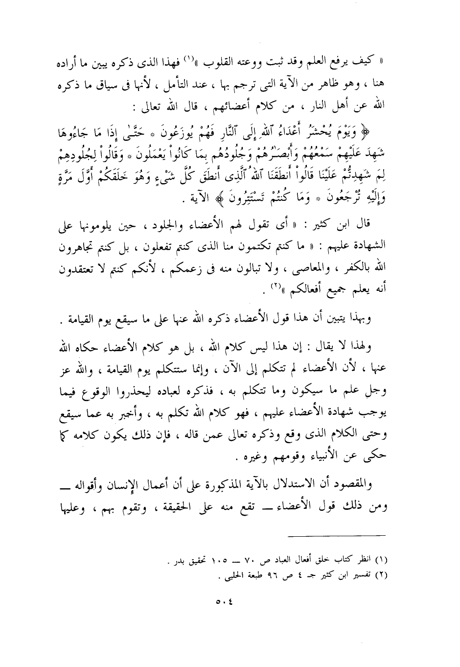 فهذا الذي ذكره يبين ما أراده هنا، وهو ظاهر من الآية التي ترجم بها، عند التأمل؛ لأنها في سياق ما ذكره الله عن أهل النار، من كلام أعضائهم، قال الله – تعالى -: {وَيَومَ يُحشَرُ أَعدَاءُ اللهِ إلىَ النَّارِ فَهُم يُوزَعُونَ {19} حَتىَ إِذَا مَا جَاءُوهَا شَهِدَ عَلَيِهِم سَمعُهُم وأَبصَارُهُم وَجُلُودُهُم بِمَا كَانُواْ يَعمَلُونَ {20} وَقَالُواْ لِجُلُودِهِم لِمَ شَهِدتُم عَلينَا قَالُوا أَنطَقَنَا اللهُ الذِي أنطَقَ كُلَّ شيءٍ وَهُوَ خَلَقَكُم أَوَلَ مَرةٍ وَإليهِ تُرجَعُونَ {21} وَمَا كُنتُم تَستَرُونَ} الآية.