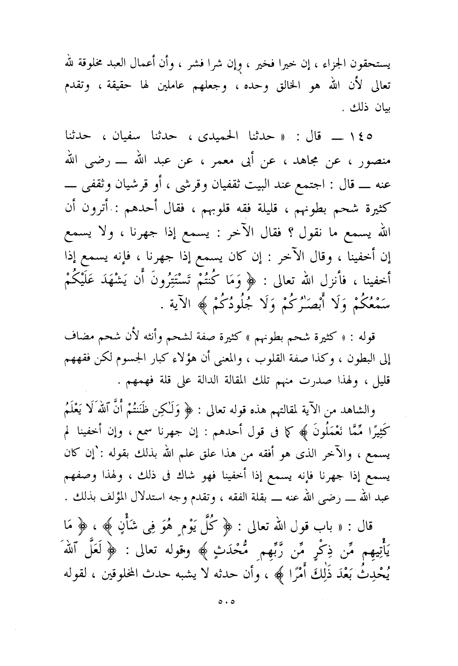 147- قال: ((حدثنا الحميدي، حدثنا سفيان، حدثنا منصور، عن مجاهد، عن أبي معمر، عن عبد الله - رضي الله عنه - قال: اجتمع عند البيت ثقفيان وقرشي أو قرشيان وثقفي - كثيرة شحم بطونهم، قليلة فقه قلوبهم، فقال أحدهم: أترون أن الله يسمع ما نقول؟ فقال الآخر: يسمع إذا جهرنا، ولا يسمع إن أخفينا، وقال الآخر: إن كان يسمع إذا جهرنا، فإنه يسمع إذا أخفينا، فأنزل الله - تعالى -: {وَمَا كُنتُمْ تَسْتَتِرُونَ أَنْ يَشْهَدَ عَلَيْكُمْ سَمْعُكُمْ وَلا أَبْصَارُكُمْ وَلا جُلُودُكُمْ} الآية.