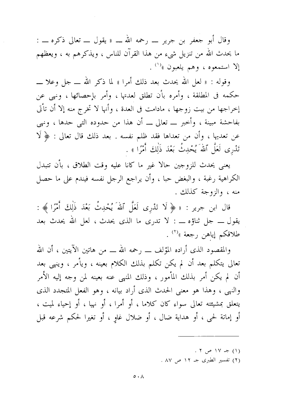 قال ابن جرير: {لاَ تَدري لَعَلَ اللهَ يُحدِث بَعدَ ذَلِكَ أَمراً} : يقول – جل ثناؤه -: لا تدري ما الذي يحدث، لعل الله يحدث بعد طلاقكم إياهن رجعة)) (¬2) .