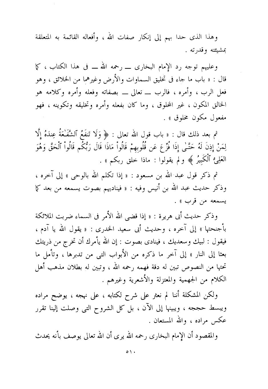 وذكر حديث أبي هريرة: (إذا قضى الله الأمر في السماء ضربت الملائكة بأجنحتها)) إلى آخره، وحديث أبي سعيد الخدري: ((يقول الله: يا آدم، فيقول: لبيك وسعديك، فينادي بصوت: إن الله يأمرك أن تخرج من ذريتك بعثاً إلى النار ... )) ، إلى آخر ما ذكره من الأبواب التي من تدبرها، وتأمل ما تحتها من النصوص، تبين له دقه فهمه رحمه الله، وتبين له بطلان مذهب أهل الكلام من الجهمية والمعتزلة والأشعرية وغيرهم.