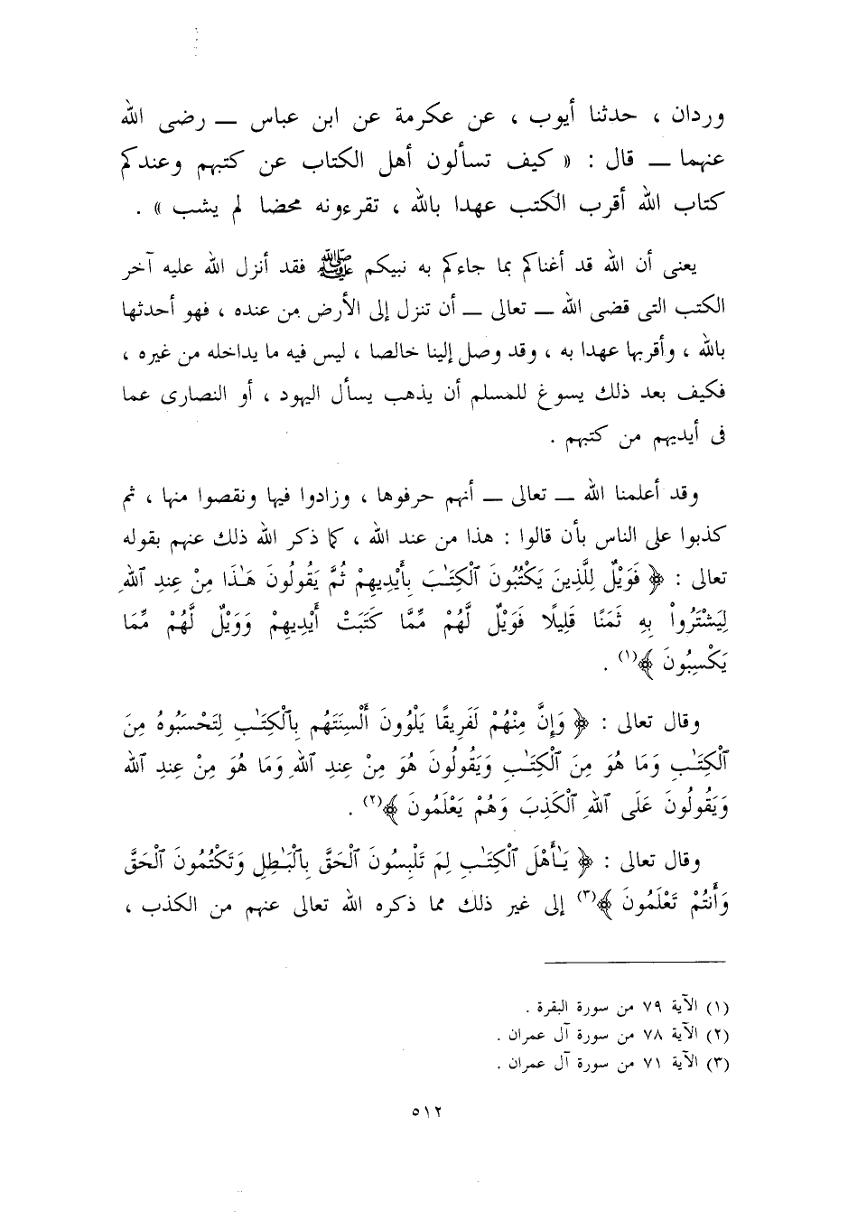 وردان، حدثنا أيوب، عن عكرمة عن ابن عباس – رضي الله عنهما – قال: ((كيف تسألون أهل الكتاب عن كتبهم وعندكم كتاب الله، أقرب الكتب عهداً بالله، تقرؤونه محضا لم يشب)) .