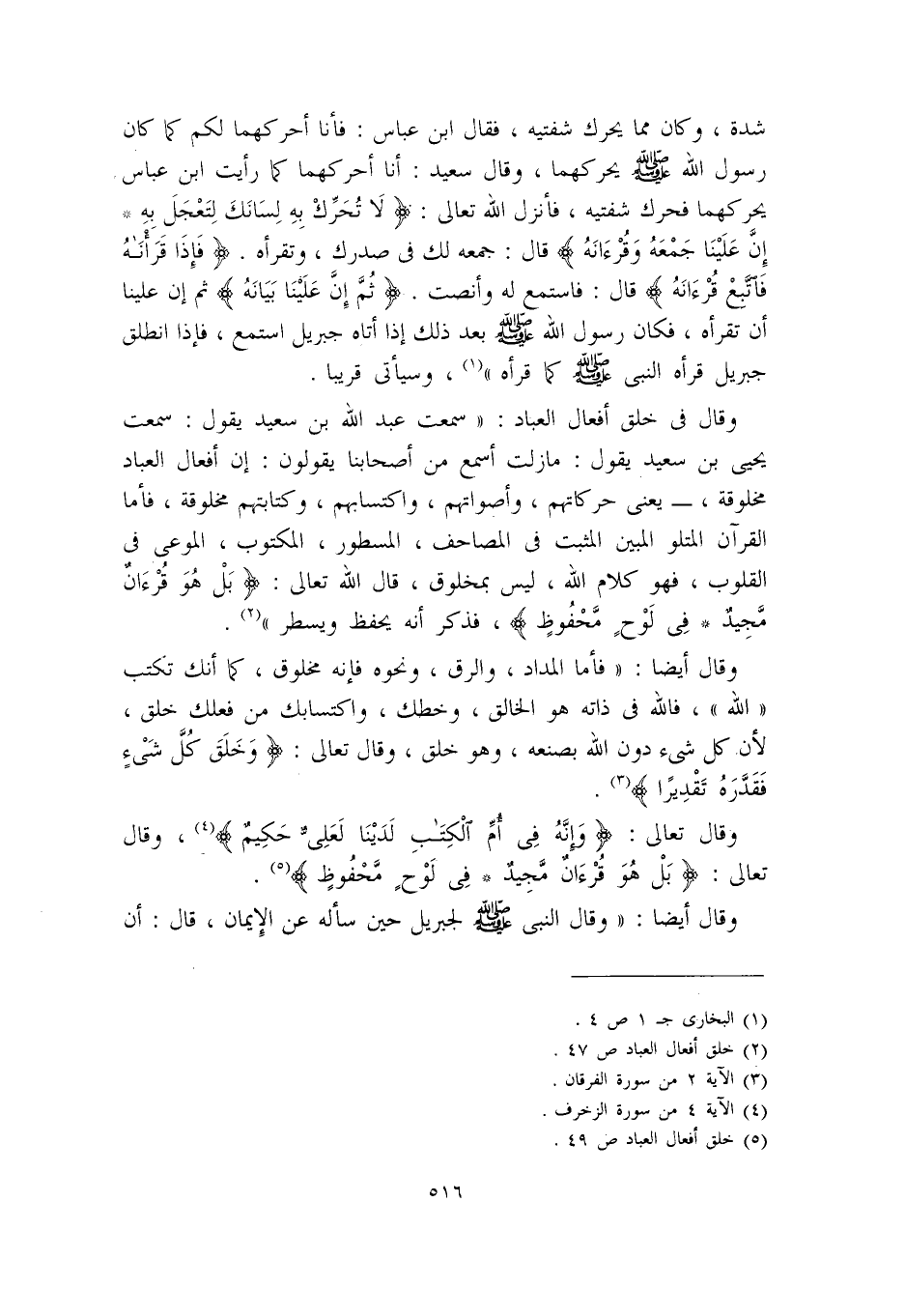 وقال في ((خلق أفعال العباد)) : ((سمعت عبد الله بن سعيد يقول: سمعت يحيى ابن سعيد يقول: ما زلت أسمع من أصحابنا يقولون: إن أفعال العباد مخلوقة، - يعني: حركاتهم، وأصواتهم، واكتسابهم، وكتابتهم مخلوقة، فأما القرآن المتلو المبين المثبت في المصاحف، المسطور، المكتوب، الموعى في القلوب، فهو كلام الله، ليس بمخلوق، قال الله – تعالى -: {بَل هُوَ قُرآنٌ مَّجِيدٌ {21} فيِ لَوحٍ مَّحفُوظِ} ، فذكر أنه يحفظ ويسطر)) (¬2) .