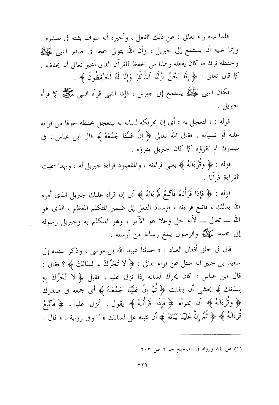 قال في ((خلق أفعال العباد)) ((حدثنا عبيد الله بن موسى، وذكر سنده إلى سعيد ابن جبير أنه سئل عن قوله تعالى: {لاَ تُحرِك بِهِ لِسَانَكَ} ؟ فقال: قال ابن عباس: كان يحرك لسانه إذا نزل عليه، فقيل: {لاَ تُحرِك بِهِ لِسَانَكَ} يخشى أن يتفلت، ثم {إِنَّ عَلَيْنَا جَمْعَهُ} أي: جمعه في صدرك {وَقُرْآنَه ُ} أن تقرأه {فَإِذَا قَرَأْنَاهُ} يقول: أنزل عليه، {فَاتَّبِعْ قُرْآنَهُ {} ثُمَّ إِنَّ عَلَيْنَا بَيَانَه} أن نثبته على لسانك)) (¬1) وفي رواية: ((قال: