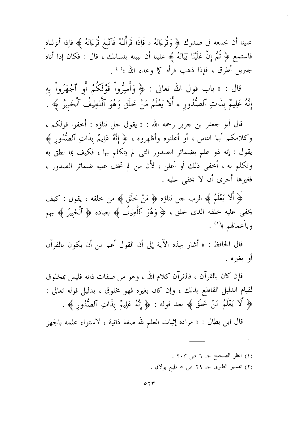 قال: ((باب قول الله - تعالى -: {وَأَسِرُّوا قَوْلَكُمْ أَوِ اجْهَرُوا بِهِ إِنَّهُ عَلِيمٌ بِذَاتِ الصُّدُورِ {13} أَلا يَعْلَمُ مَنْ خَلَقَ وَهُوَ اللَّطِيفُ الْخَبِيرُ} يتخافتون: يتسارون.