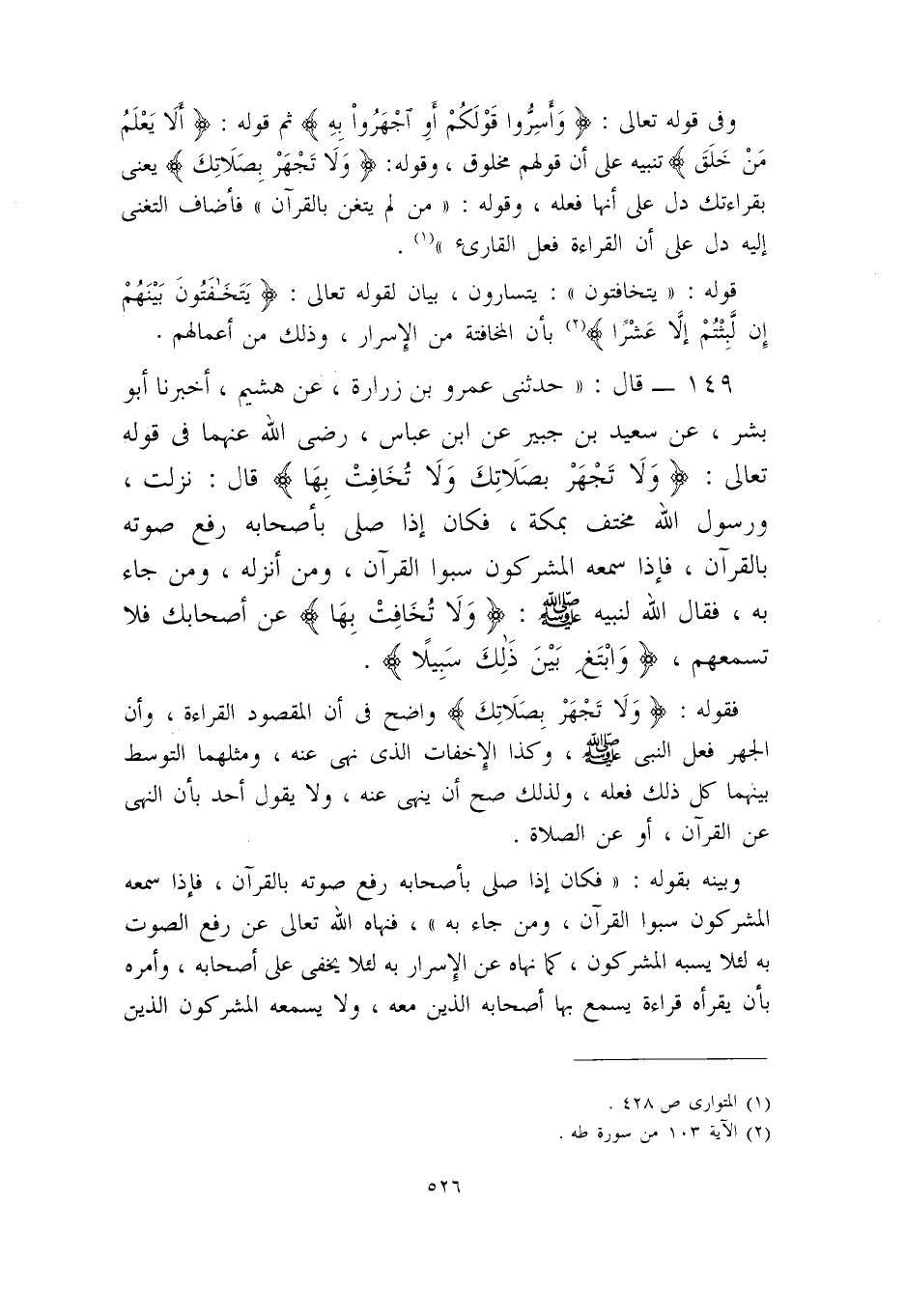 151- قال: ((حدثني عمرو بن زرارة، عن هشيم، أخبرنا أبو بشر، عن سعيد ابن جبير عن ابن عباس – رضي الله عنهما – في قوله تعالى: {وَلاَ تَجهَر بِصَلاَتِكَ وَلاَ تُخَافِت بِهاَ} قال: نزلت، ورسول الله مختف بمكة، فكان إذا صلى بأصحابه رفع صوته بالقرآن، فإذا سمعه المشركون سبوا القرآن، ومن أنزله، ومن جاء به، فقال الله لنبيه – صلى الله عليه وسلم -: {وَلاَ تَجهَر بِصَلاَتِكَ} أي بقراءتك فيسمع المشركون فيسبوا القرآن {وَلاَ تُخَافِت بِهاَ} عن أصحابك فلا تسمعهم، {وَابْتَغِ بَيْنَ ذلِكَ سَبِيلاً} .