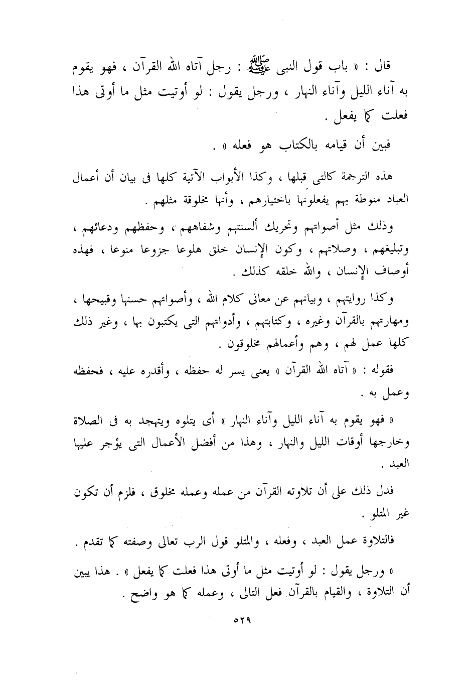 ((ورجل يقول: لو أوتيت مثل ما أوتي هذا فعلت كما يفعل)) . هذا يبين أن التلاوة، والقيام بالقرآن فعل التالي، وعمله، كما هو واضح.