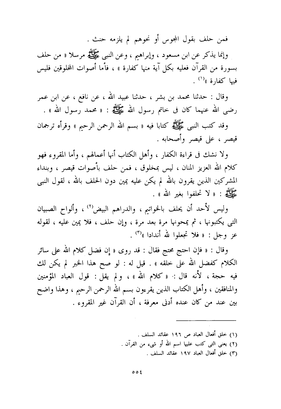 ولا نشك في قراءة الكفار، وأهل الكتاب، أنها أعمالهم، وأما المقروء فهو كلام الله العزيز المنان، ليس بمخلوق، فمن حلف بأصوات قيصر، وبنداء المشركين الذين يقرون بالله، لم يكن عليه يمين دون الحلف بالله؛ لقول النبي – صلى الله عليه وسلم -: ((لا تحلفوا بغير الله)) .