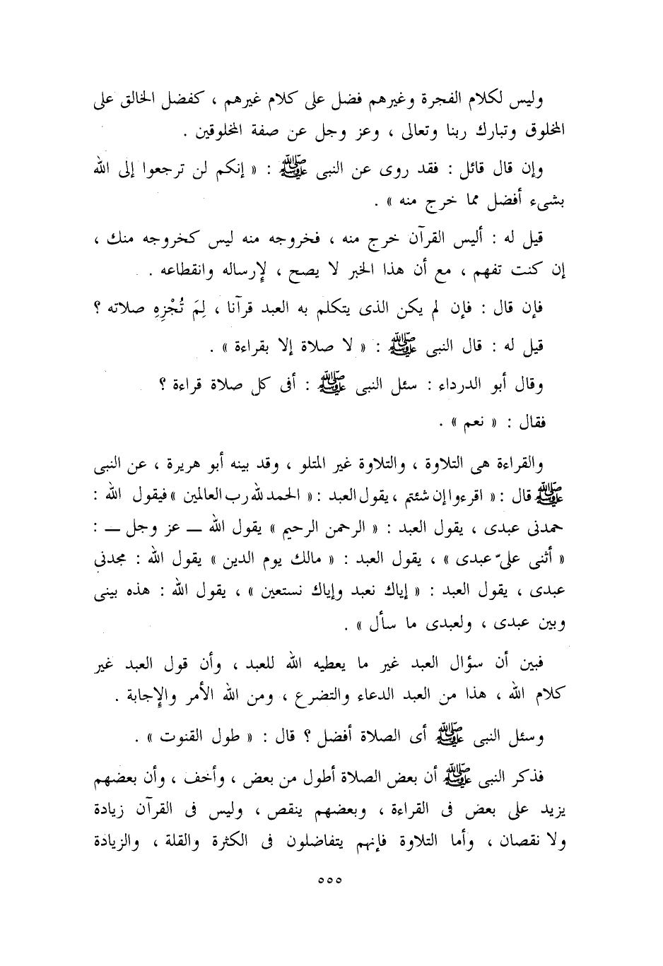 والقراءة هي التلاوة، والتلاوة غير المتلو، وقد بينه أبو هريرة، عن النبي – صلى الله عليه وسلم – قال: ((اقرءوا إن شئتم، يقول العبد: ((الحمد لله رب العالمين)) فيقول الله: حمدني عبدي، يقول العبد: ((الرحمن الرحيم)) يقول الله – عز وجل -: ((أثنى عليّ عبدي)) ، يقول العبد: ((مالك يوم الدين)) يقول الله: مجدني عبدي، يقول العبد: ((إياك نعبد وإياك نستعين)) ، يقول الله: هذه بيني وبين عبدي، ولعبدي ما سأل)) .