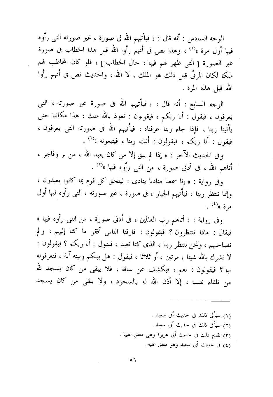 الوجه السادس: أنه قال: ((فيأتيهم الله في صورة، غير صورته التي رأوه فيها أول مرة)) (¬1) ، وهذا نص في أنهم رأوا الله قبل هذا الخطاب في صورة غير الصورة [التي ظهر لهم فيها حال الخطاب] ، فلو كان المخاطب لهم ملكاً لكان المرئي قبل ذلك هو الملك، لا الله، والحديث نص في أنهم رأوا الله قبل هذه المرة.
