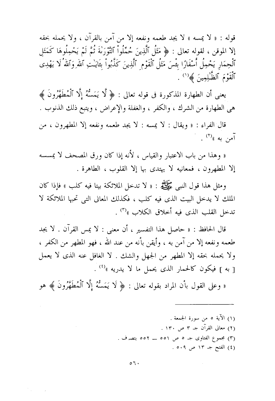 قال الحافظ: ((حاصل هذا التفسير، أن معنى: لا يمس القرآن: لا يجد طعمه ونفعه إلا من آمن به، وأيقن بأنه من عند الله، فهو المطهر من الكفر، ولا يحمله بحقه إلا المطهر من الجهل والشك، لا الغافل عنه الذي لا يعمل [به] فيكون كالحمار الذي يحمل ما لا يدريه)) (¬4) .