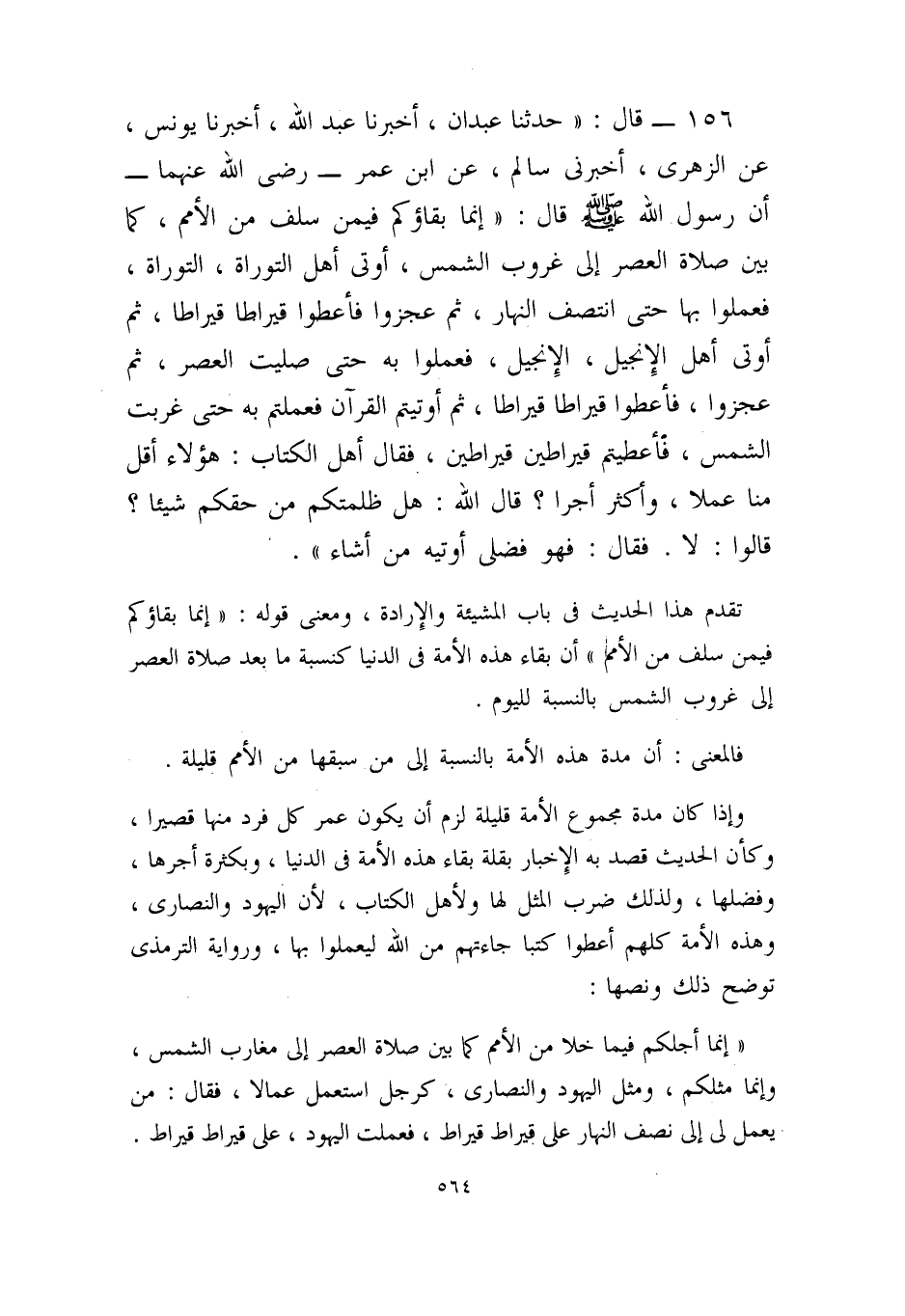 158- قال: ((حدثنا عبدان، أخبرنا عبد الله، أخبرنا يونس، عن الزهري، أخبرني سالم، عن ابن عمر – رضي الله عنهما – أن رسول الله – صلى الله عليه وسلم – قال: ((إنما بقاؤكم فيمن سلف من الأمم، كما بين صلاة العصر إلى غروب الشمس، أوتي أهل التوراة، التوراة، فعملوا بها حتى انتصف النهار، ثم عجزوا فأعطوا قيراطا قيراطا، ثم أوتي أهل الإنجيل، الإنجيل، فعملوا به حتى صليت العصر، ثم عجزوا، فأعطوا قيراطا قيراطا، ثم أوتيتم القرآن فعملتم به حتى غربت الشمس، فأعطيتم قيراطين قيراطين، فقال أهل الكتاب: هؤلاء أقل منا عملا، وأكثر أجرا؟ قال الله: هل ظلمتكم من حقكم شيئا؟ قالوا: لا. فقال: فهو فضلي أوتيه من أشاء)) .