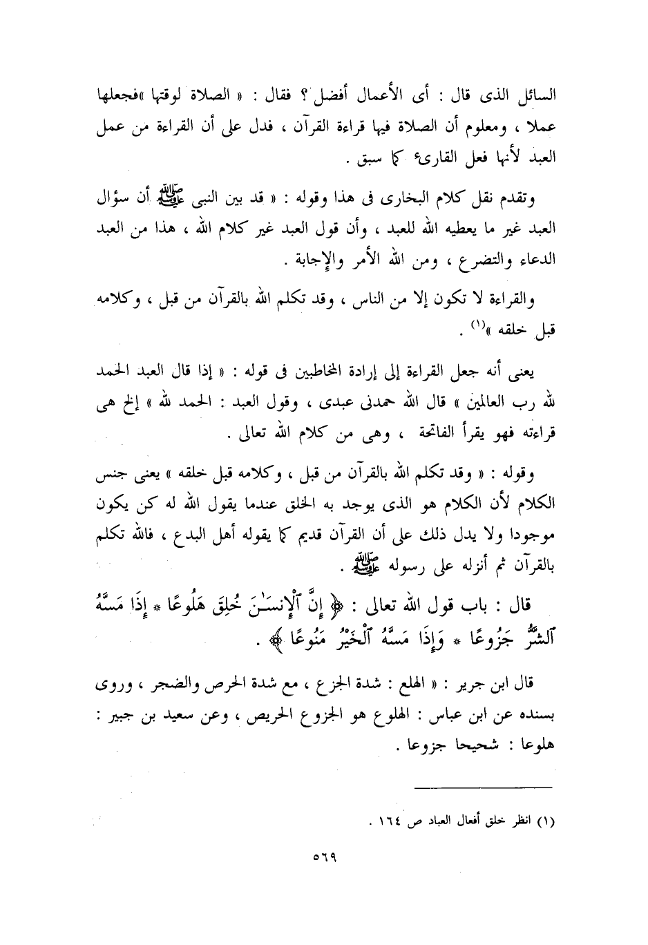 السائل الذي قال: أي الأعمال أفضل؟ فقال: ((الصلاة لوقتها)) فجعلها عملاً، ومعلوم أن الصلاة فيها قراءة القرآن، فدل على أن القراءة من عمل العبد؛ لأنها فعل القارئ، كما سبق، وتقدم نقل كلام البخاري في هذا، وقوله: ((قد بين النبي - صلى الله عليه وسلم - أن سؤال العبد غير ما يعطيه الله للعبد، وأن قول العبد غير كلام الله، هذا من العبد الدعاء والتضرع، ومن الله الأمر والإجابة.