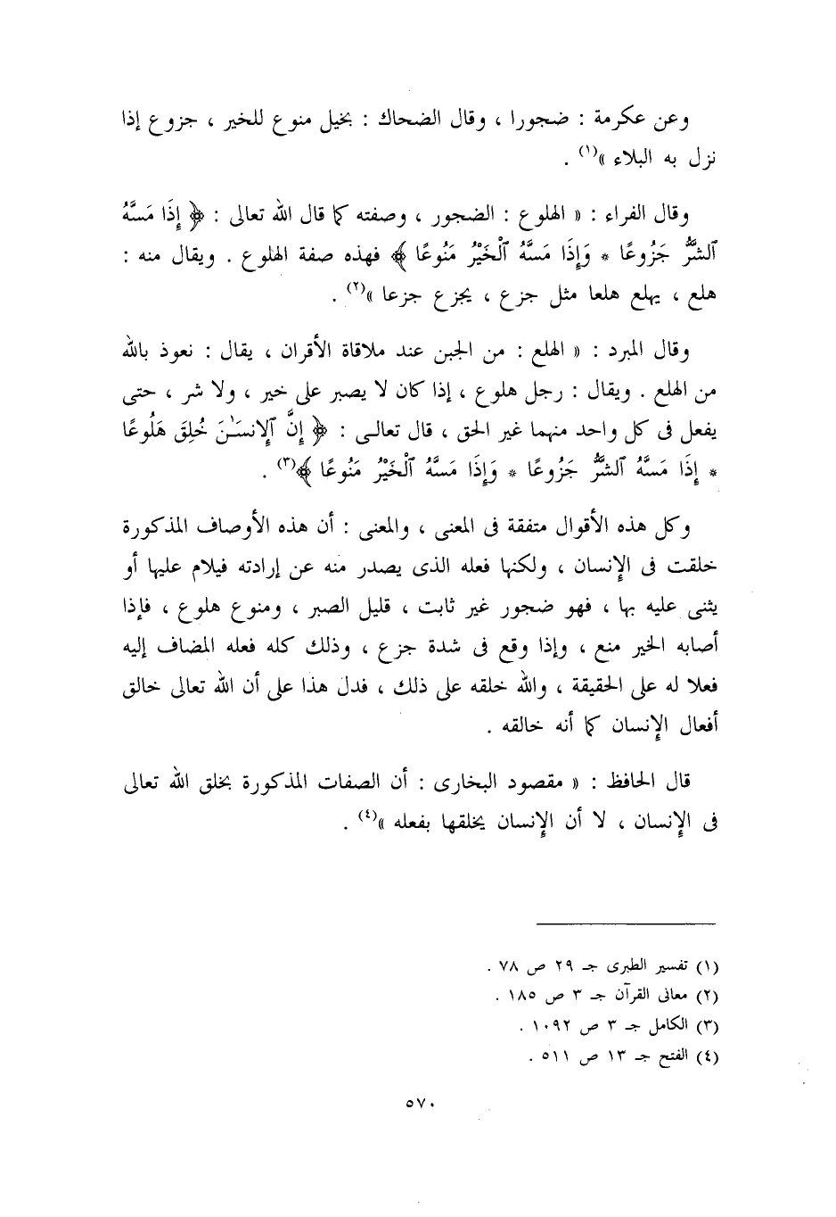 وكل هذه الأقوال متفقة في المعنى، والمعنى: أن هذه الأوصاف المذكورة خلقت في الإنسان، ولكنها فعله الذي يصدر منه عن إرادته، فيلام عليها أو يثنى عليه بها، فهو ضجور غير ثابت، قليل الصبر، ومنوع هلوع، فإذا أصابه الخير منع، وإذا وقع في شدة جزع، وذلك كله فعله المضاف إليه فعلاً له على الحقيقة، والله خلقه على ذلك، فدل هذا على أن الله – تعالى – خالق أفعال الإنسان كما أنه خالقه.