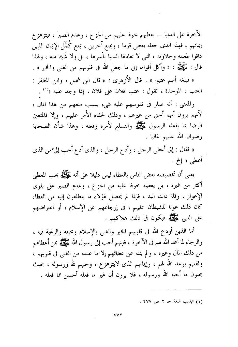 يعني: أن تخصيصه بعض الناس بالعطاء ليس دليلاً على أنه - صلى الله عليه وسلم - يحب المعطي أكثر من غيره، بل يعطيه خوفاً عليه من الجزع، وعدم الصبر على بلوى الإعواز، وقلة ذات اليد، فإذا لم يحصل لهؤلاء ما يتطلعون إليه من العطاء كان ذلك عونا للشيطان عليهم، في إرجاعهم عن الإسلام، أو اعتراضهم على النبي – صلى الله عليه وسلم -، فيكون في ذلك هلاكهم.