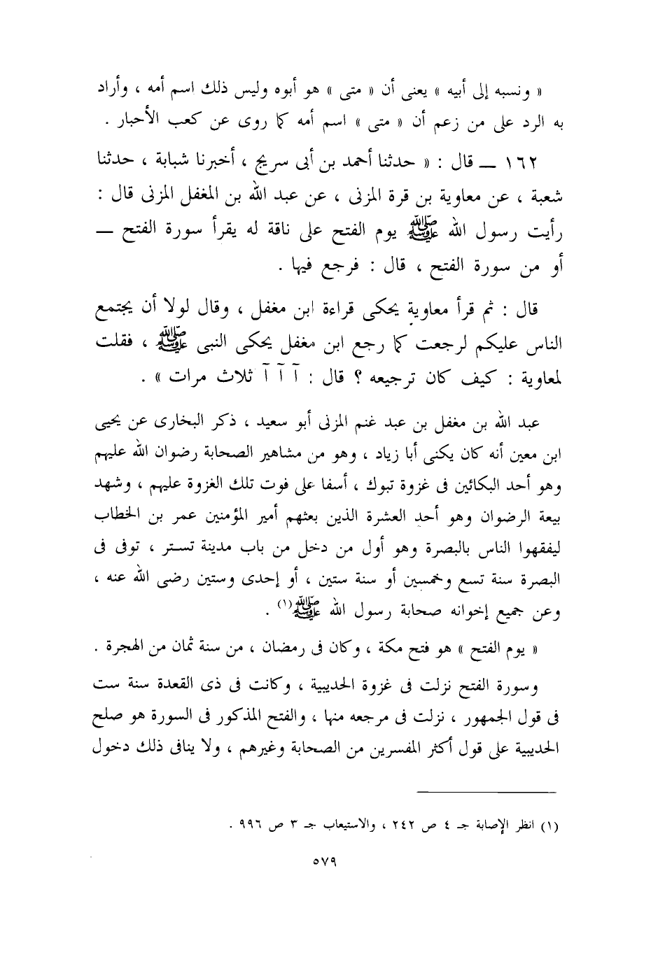 165- قال: ((حدثنا أحمد بن أبي سريج، أخبرنا شبابة، حدثنا شعبة، عن معاوية بن قرة المزني، عن عبد الله بن المغفل المزني، قال: رأيت رسول الله - صلى الله عليه وسلم – يوم الفتح على ناقة له يقرأ سورة الفتح – أو من سورة الفتح – قال: فرجع فيها.