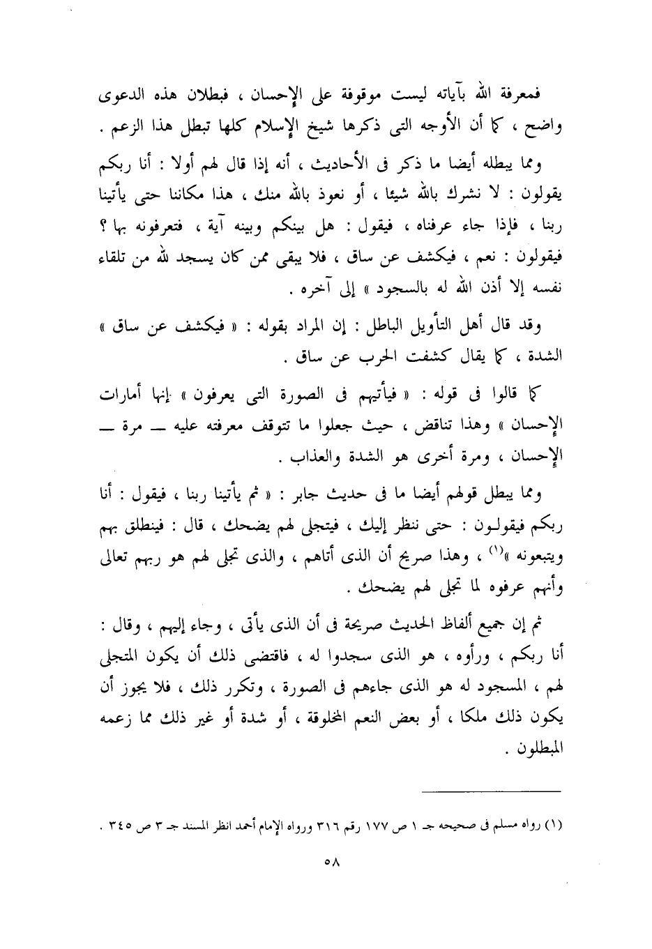 ثم إن جميع ألفاظ الحديث صريحة في أن الذي يأتي، وجاء إليهم، وقال: أنا ربكم، ورأوه، هو الذي سجدوا له، فاقتضى ذلك أن يكون المتجلي لهم، المسجود له، هو الذي جاءهم في الصورة، وتكرر ذلك، فلا يجوز أن يكون ذلك ملكاً، أو بعض النعم المخلوقة، أو شدة، أو غير ذلك مما زعمه المبطلون.