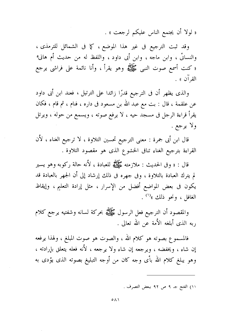 والمقصود أن الترجيع فعل الرسول –صلى الله عليه وسلم – بحركة لسانه وشفتيه يرجع كلام ربه الذي أبلغه الأمة عن الله – تعالى -.