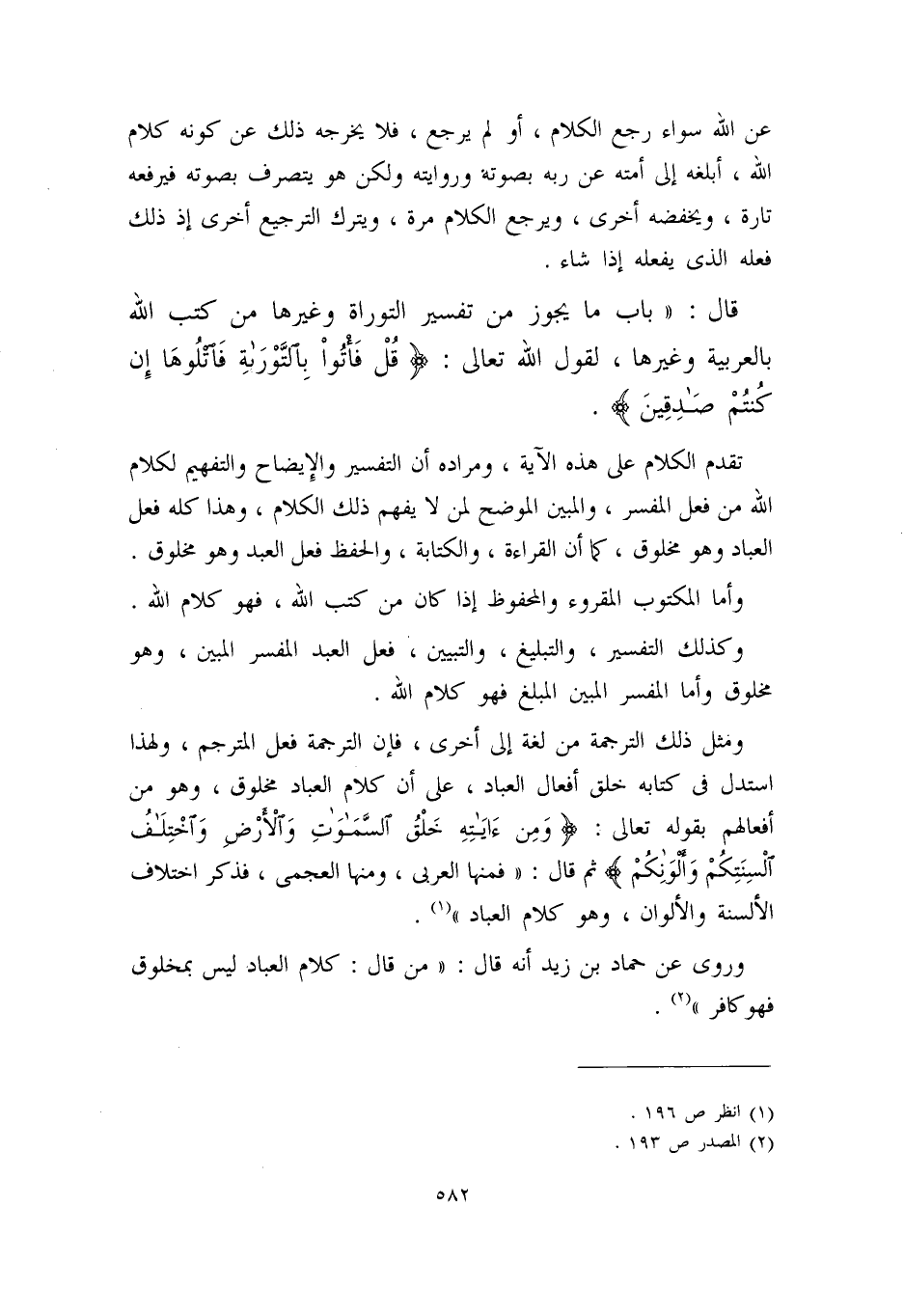 ومثل ذلك الترجمة من لغة إلى أخرى، فإن الترجمة فعل المترجم، ولهذا استدل في كتابه: ((خلق أفعال العباد)) ، على أن كلام العباد مخلوق، وهو من أفعالهم بقوله تعالى: {وَمِن أيَاتِهِ خَلقُ السّمَاوَاتِ وَالأَرضِ وَاختِلاَفُ أَلسِنَتِكُم وَألَوَانِكُم} ، ثم قال: ((فمنها العربي، ومنها العجمي، فذكر اختلاف الألسنة والألوان، وهو كلام العباد)) (¬1) .