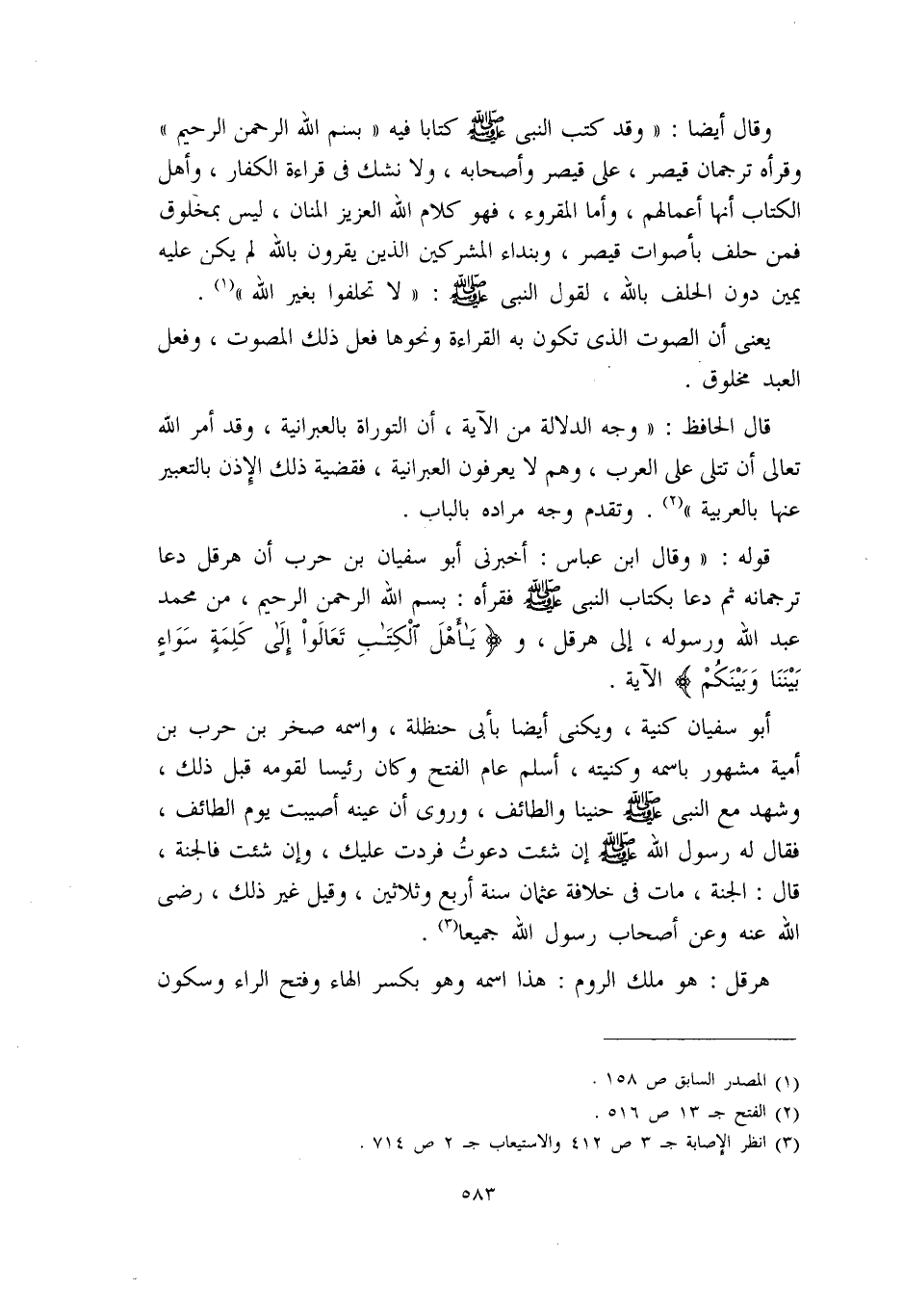 وقال أيضا: ((وقد كتب النبي – صلى الله عليه وسلم – كتابا فيه ((بسم الله الرحمن الرحيم)) وقرأه ترجمان قيصر، على قيصر وأصحابه، ولا نشك في قراءة الكفار وأهل الكتاب أنها أعمالهم، وأما المقروء فهو كلام الله العزيز المنان، ليس بمخلوق، فمن حلف بأصوات قيصر، وبنداء المشركين الذين يقرون بالله لم يكن عليه يمين دون الحلف بالله؛ لقول النبي – صلى الله عليه وسلم -: ((لا تحلفوا بغير الله)) (¬1) .