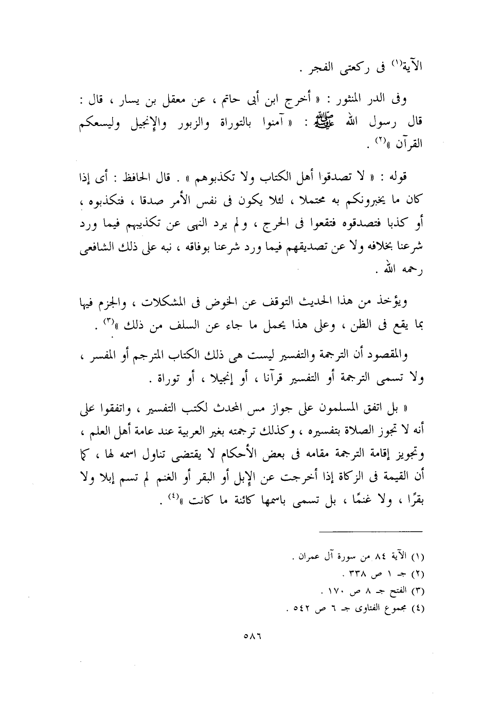 ((بل اتفق المسلمون على جواز مس المحدث لكتب التفسير، واتفقوا على أنه لا تجوز الصلاة بتفسيره، وكذلك ترجمته بغير العربية عند عامة أهل العلم، وتجويز إقامة الترجمة مقامه في بعض الأحكام لا يقتضي تناول اسمه لها، كما أن القيمة في الزكاة إذا أخرجت عن الإبل أو البقر أو الغنم لم تسم إبلا ولا بقرا، ولا غنما، بل تسمى باسمها كائنة ما كانت)) (¬4) .