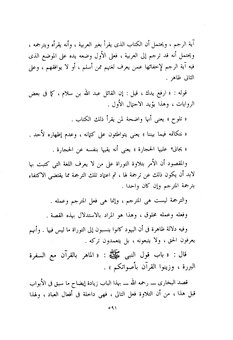 والمقصود: أن الأمر بتلاوة التوراة على من لا يعرف اللغة التي كتبت بها لا بد أن يكون ذلك عن ترجمة لها، ثم اعتماد تلك الترجمة مما يقتضي الاكتفاء بترجمة المترجم وإن كان واحداًً.