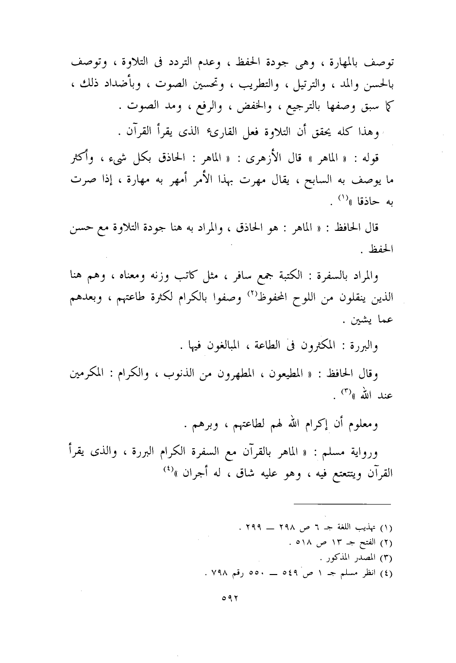 قال الحافظ: ((الماهر هو: الحاذق، والمراد به هنا: جودة التلاوة مع حسن الحفظ.