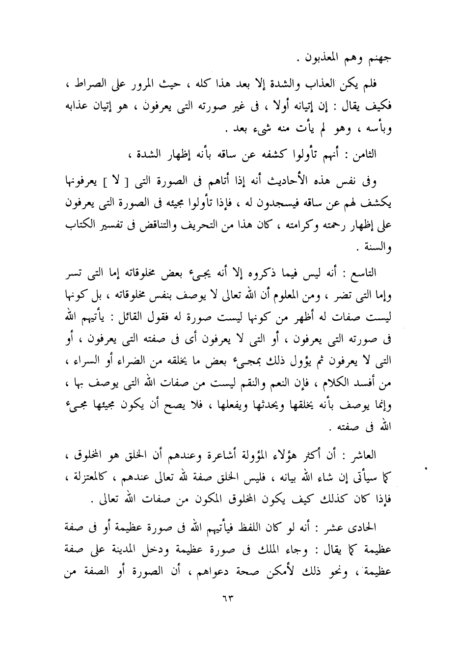 التاسع: أنه ليس في ما ذكره إلا أنه يجيء بعض مخلوقاته، إما التي تسر، وإما التي تضر، ومن المعلوم أن الله – تعالى – لا يوصف بنفسه مخلوقاته، بل كونها ليست صفات له أظهر من كونها ليست صورة له، فقول القائل: يأتيهم الله في صورته التي يعرفون، أو التي لا يعرفون، أي في صفته التي يعرفون، أو التي لا يعرفون، ثم يؤول ذلك بمجيء بعض ما يخلقه من الضراء أو السراء، من أفسد الكلام، فإن النعم والنقم ليست من صفات الله التي يوصف بها، وإنما يوصف بأنه يخلقها ويحدثها ويفعلها، فلا يصح أن يكون مجيئها مجيء الله في صفته.