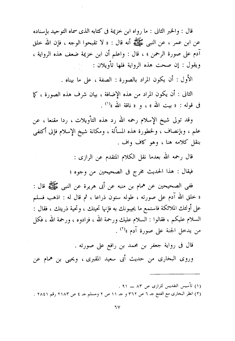قال: والخبر الثاني: ما رواه ابن خزيمة في كتابه الذي سماه ((التوحيد)) بإسناده عن ابن عمر، عن النبي – صلى الله عليه وسلم – أنه قال: ((لا تقبحوا الوجه، فإن الله خلق آدم على صورة الرحمن)) ، قال: واعلم أن ابن خزيمة ضعف هذه الرواية، ويقول: إن صحت هذه الرواية فلها تأويلان: