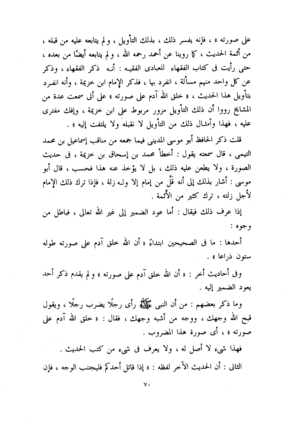 على صورته)) ، فإنه: يفسر ذلك بذلك التأويل، ولم يتابعه عليه من قبله من أئمة الحديث، كما روينا عن أحمد – رحمه الله -، ولم يتابعه أيضاً من بعده، حتى رأيت في كتاب الفقهاء للعبادي الفقيه: أنه ذكر الفقهاء، وذكر عن كل واحد منهم مسألة انفرد بها، فذكر الإمام ابن خزيمة، وأنه انفرد بتأويل هذا الحديث: ((خلق الله آدم على صورته)) ، على أني سمعت عدة من المشايخ رووا أن ذلك التأويل مزور مربوط على ابن خزيمة، وإفك مفترى عليه، فهذا وأمثال ذلك من التأويل لا نقبله ولا يلتفت إليه)) .
